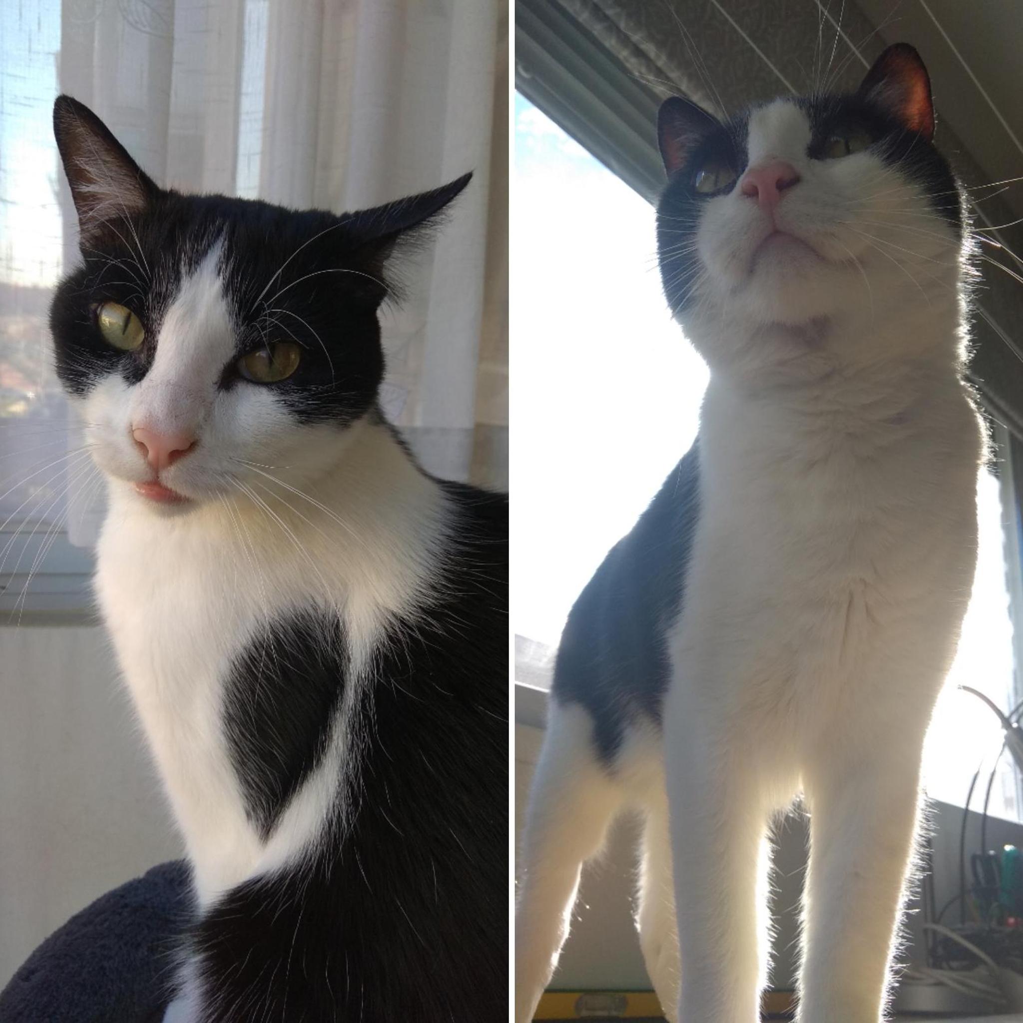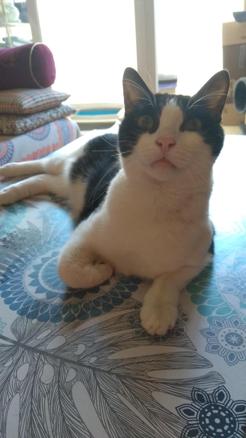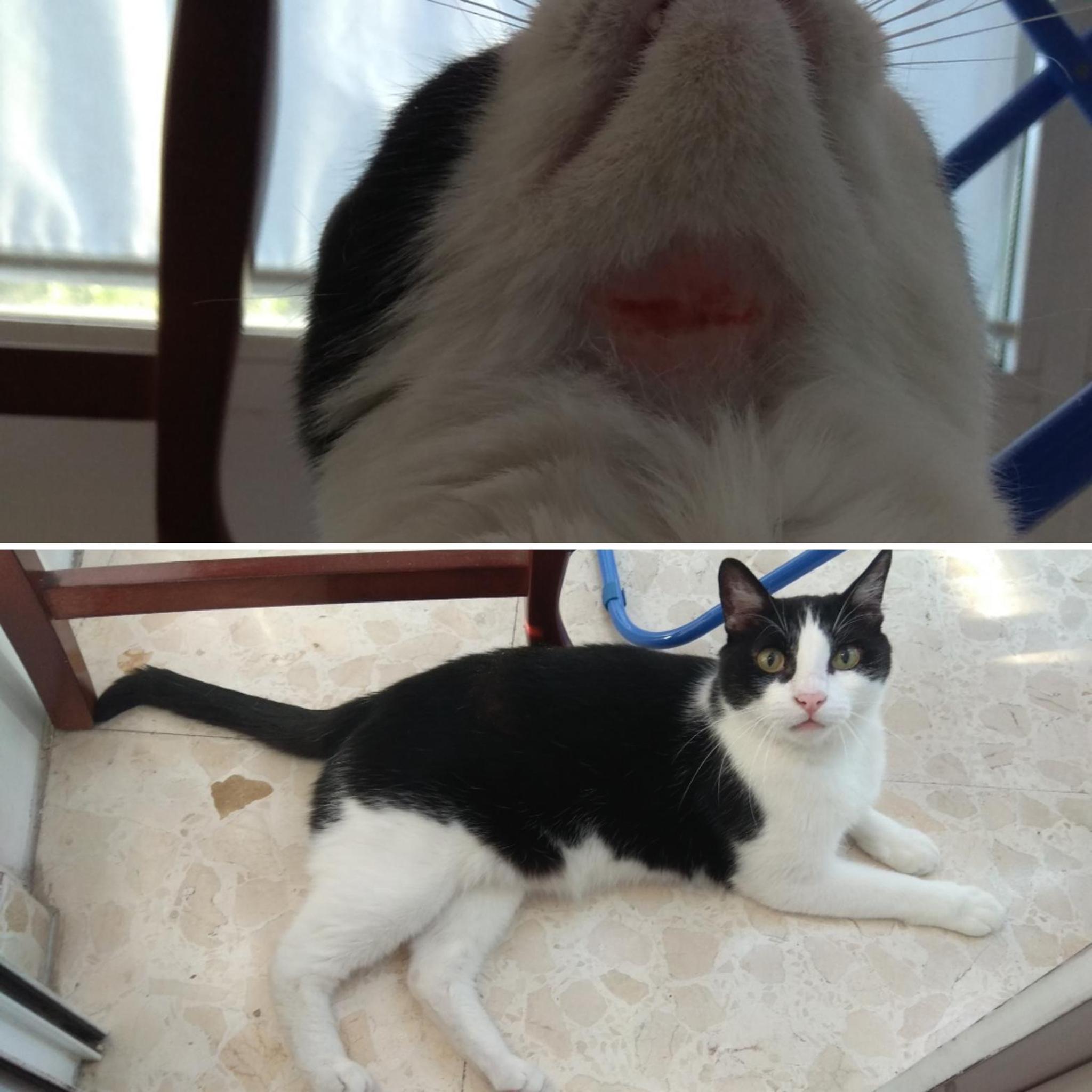 Enviamos fotos al Hospital Felino, en la de abajo enseño mi calva bajo la barbilla. De vez en cuando me rasco y me hago alguna herida, pero nada importante, está bastante mejor. Continuamos con Apoquel, Gabapentina y collar a ratos. Y seguimos valorando la opción del nuevo tratamiento, porque a largo plazo podría suponer una reducción de medicación o incluso quitarla por completo, pero primero supone aumentar medicamentos y sin ninguna certeza de que vaya a funcionar...