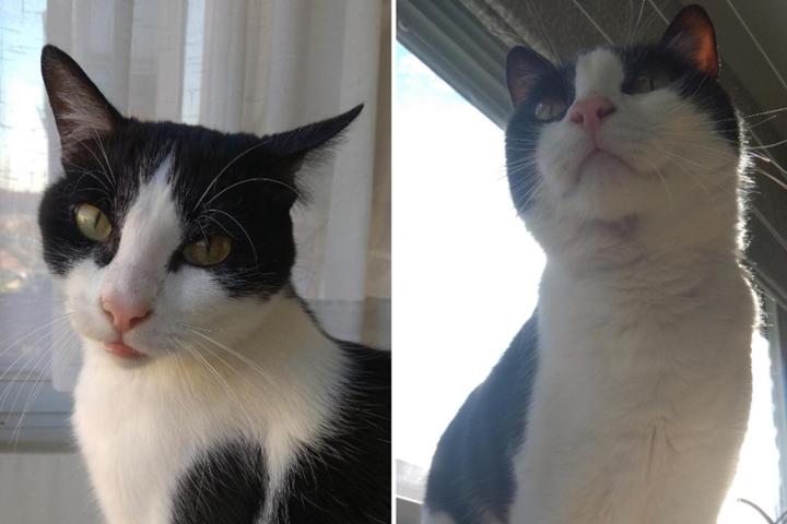 Enviamos fotos al Hospital Felino, en la de abajo enseño mis ojitos en un rato sin collar para celebrar que llevo ya dos años con la humana. Ya no tengo herida en la calva de debajo de la barbilla, pero la piel está un poco roja, así que de momento voy a seguir con el collar un poco más de tiempo, pero con descansos. Continuamos con Apoquel y Gabapentina.