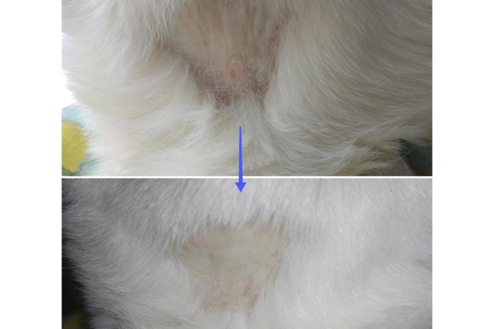 La humana me ve una nueva eccema en mi calva de la barbilla, así que mandamos foto al Hospital Felino (foto de arriba). No obtuvimos respuesta, pero la eccema no fue a más y ahora ya tengo bien la piel de la zona (foto de abajo). Así que no volvemos al Urbason y esperamos que siga por buen camino.