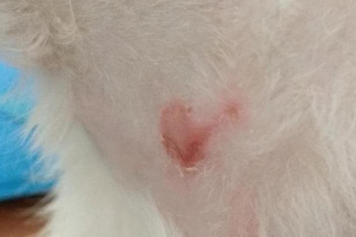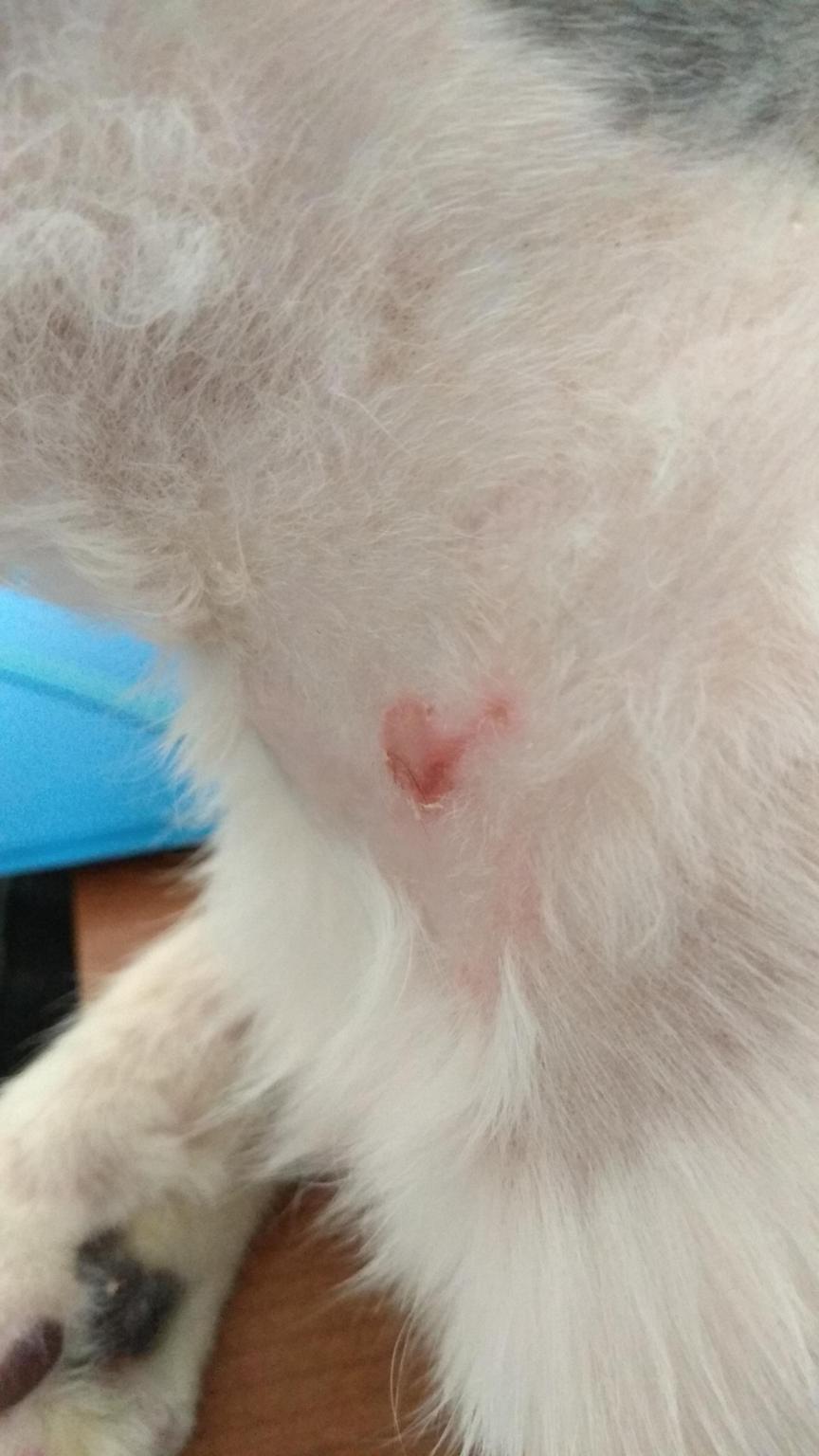 El lunes mi humana tuvo que ponerse en contacto con mis veterinarios porque llevaba dos días con intentos puntuales de rascarme y al final me hice una herida en el cuello (como veis en la foto). Pero me volvieron a subir el Urbason a la dosis anterior y de momento no me he vuelto a rascar. Ojalá siga así!!