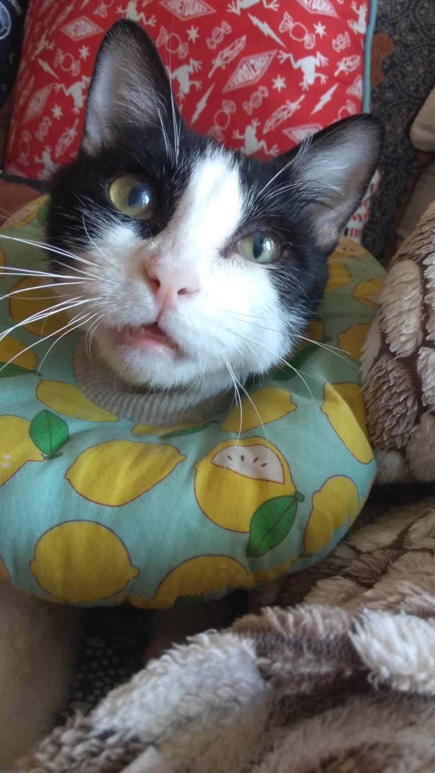 Mis ojos siguen recuperándose bien. Con la subida del Urbason a la dosis anterior, me ha disminuido el picor y casi no me rasco, pero la zona del cuello en la que me hice la herida no mejora, así que la humana me va a poner pomada Celestoderm con Gentamicina durante 3-4 días para evitar infección. El resto de medicación sigue igual y tengo que volver a tener puesto el collar isabelino.