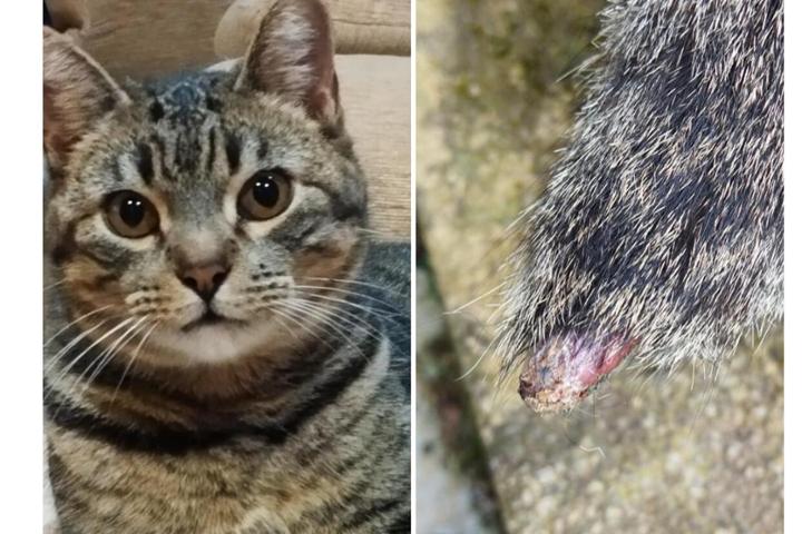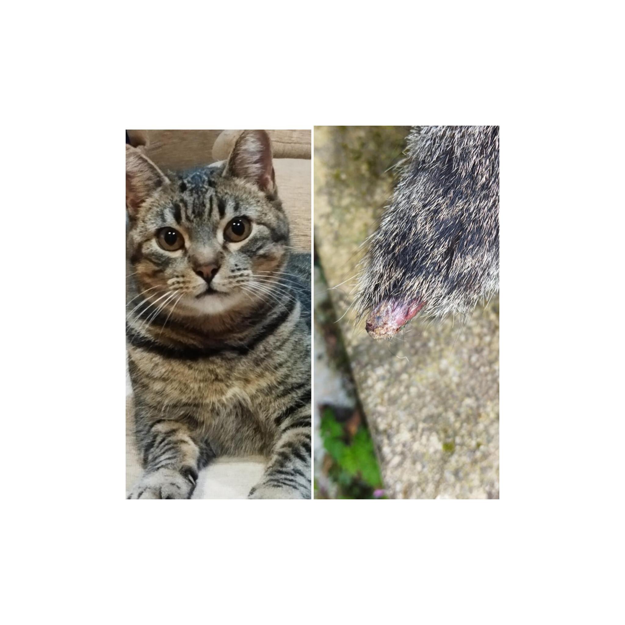 Comenzaremos con Amedio que apareció hace ya 4 años en la casa de una compañera. El cómo llegó hasta allí nunca lo sabremos pero lo que sí vimos es que tenía el rabo amputado más de 2/3 y en carne viva como se aprecia en la segunda foto que nos costó bastante curarlo pero bueno, ahora goza de un mini rabo muy pomposo . Ya era adulto en el 2022 cuando llegó a nosotras y aunque no sabemos su edad exacta, rondará los 11-12 años llevados con una elegancia y un saber estar que ya quisiéramos muchos .