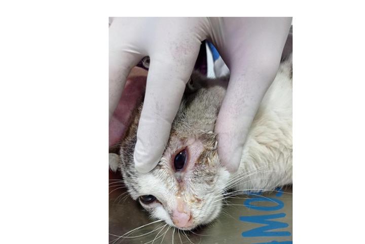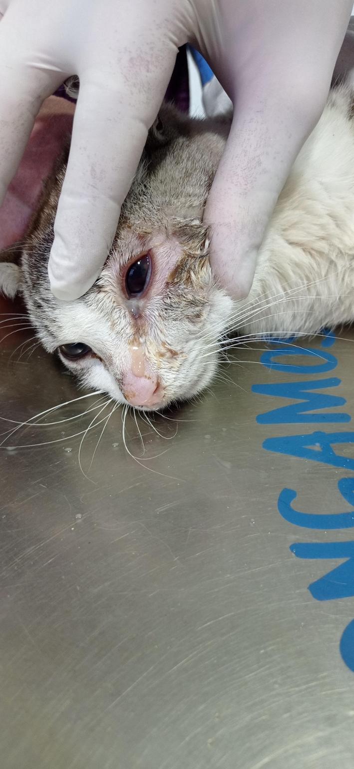 Hace unos días recogimos a Blue en una colonia felina en unas condiciones lamentables. Estaba muy deshidratado, extremadamente débil y con un ojo en muy mal estado, hasta el punto de que lo ha perdido. No ve por ese ojo y tenía mucha infección y pus.