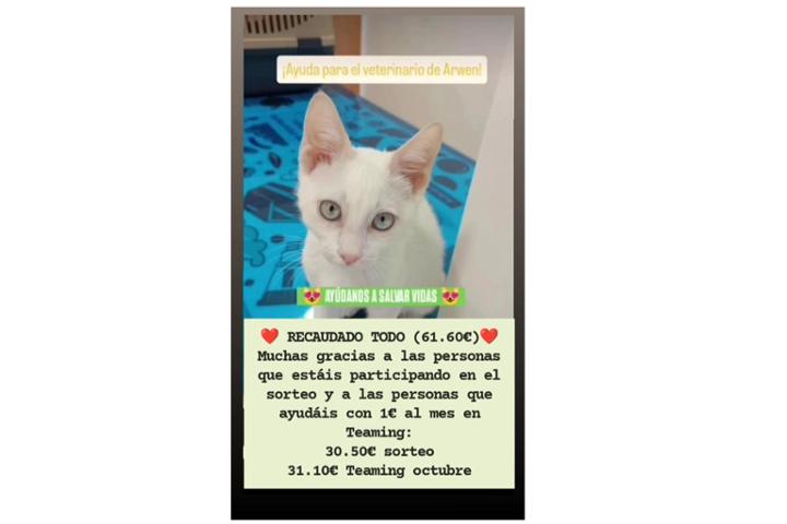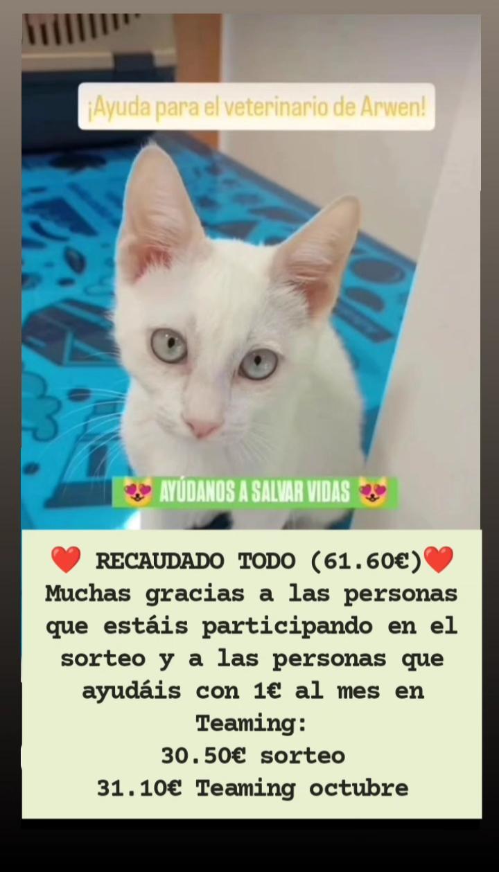 Retirados 49€ del mes de octubre destinados a: 15€ mantenimiento cuenta y 34€ para la recaudación que tenemos abierta para Aria. Aria es una gatita muy especial que tenemos en acogida ya más de dos años, que sigue en busca de un hogar, aunque precisamente por lo especial de su caso está siendo muy difícil, pero no dejaremos de intentarlo. Aria tiene herpesvirus crónico, lo cual le genera que necesite tratamiento y revisiones veterinarias periódicas. En una de sus ultimas revisiones se le encontró un bulto en la cara, al lado de las fosas nasales, y según lo visto, esto es lo que le provoca que recaiga una y otra vez. Este bulto le tapona una de sus cosas nasales, lo que produce que se acumulen muchas bacterias y tenga infección tras infección respiratoria. Por todo ello, una de las recaudaciones abiertas de Aria es para poder pagarle un TAC del cráneo+ recogida de muestra, prueba que asciende a los 465€ y de los que llevamos actualmente con lo retirado del mes de octubre 115€. ¡Hemos abierto también un sorteo donde el ganador/a se llevará 100€! Todo esto para que Aria pueda tener la atención veterinaria que necesita. Tenéis toda la información sobre el caso de Aria y el sorteo en nuestras redes sociales Cómo siempre un millón de gracias por vuestra colaboración, sin vuestra ayuda animales como Aria no podrían tener la oportunidad que tanto merecen.