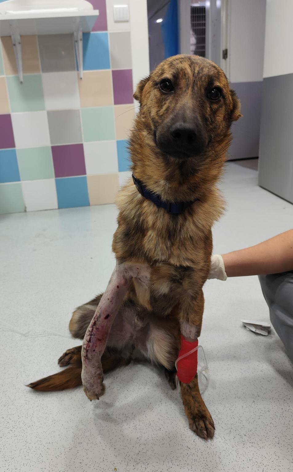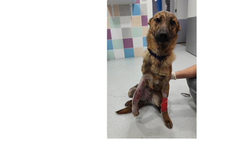 Chegou sem conseguir apoiar a pata da frente direita e com várias lacerações.