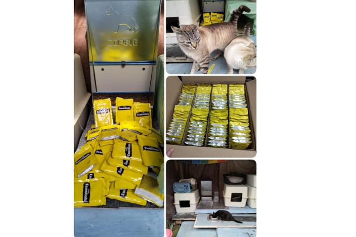 Queremos daros las gracias de corazón por vuestra ayuda y apoyo constante. Gracias a vuestro 1€ hemos podido comprar sobres de comida húmeda y una tolva para colocar el pienso en la zona delantera de las chabolas, donde más tiempo pasan Momo y Ele, para proteger el pienso de la intemperie y facilitando que puedan comer tranquilos.