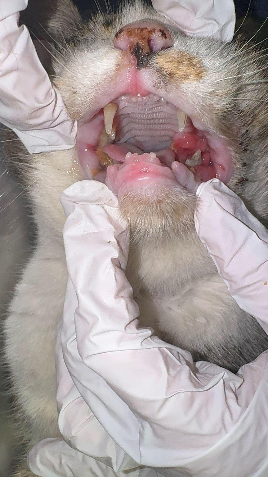 Cuando la infección esté más controlada y los valores lo permitan, será necesario realizar una extracción dental, ya que la gingivoestomatitis es probablemente el origen principal de la infección crónica.