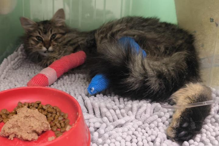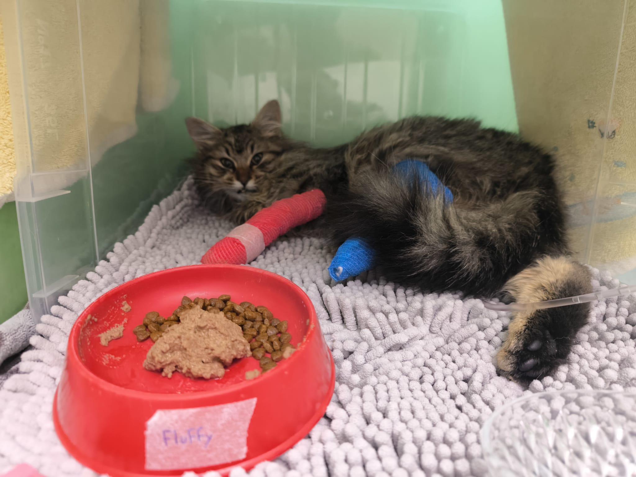Flufly es una gatita rescatada de la calle que ha sufrido un accidente doméstico tras una caída desde un 5º piso en su casa de acogida. Actualmente se encuentra ingresada en el hospital veterinario para control y tratamiento.