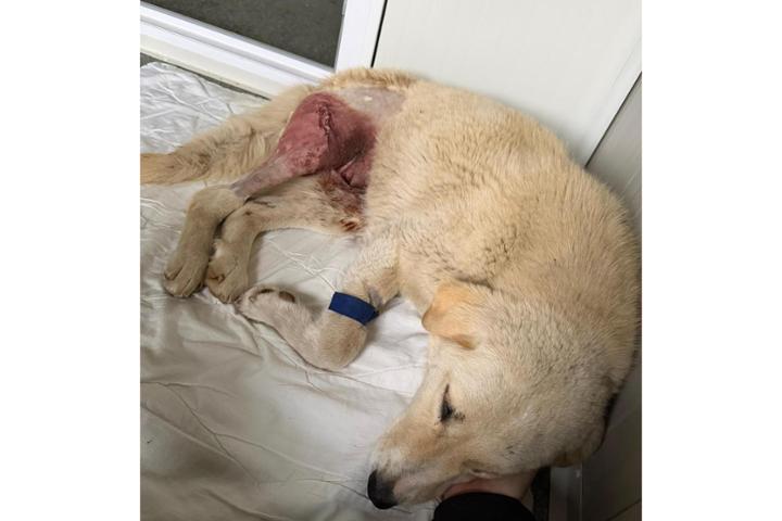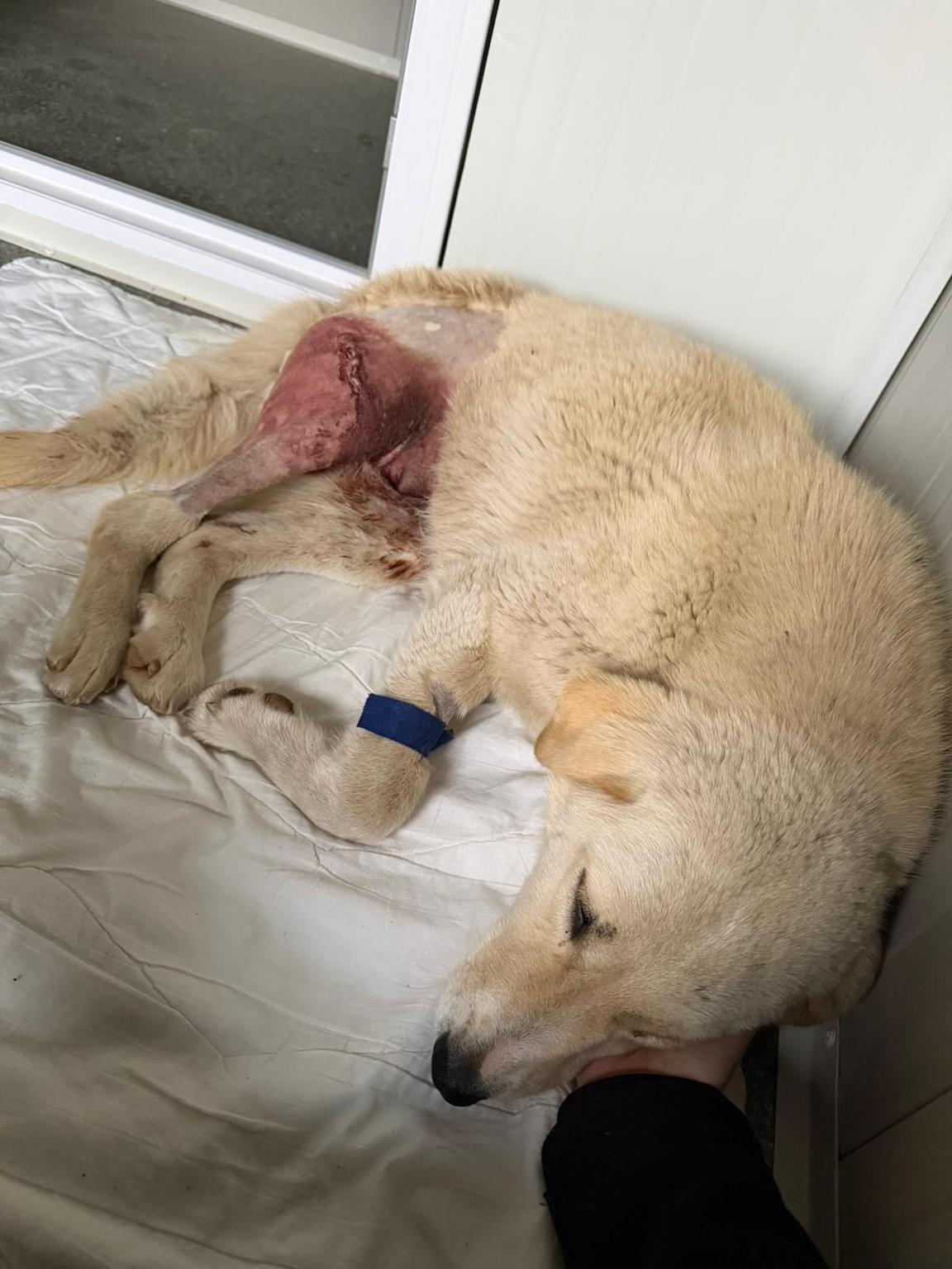 Gnocci - ist einer der Hunde die vor kurzem zu uns gekommen sind. Sie wurde operiert da sie einen offenen Bruch hatte, wer weiss schon wie lange! Wir hoffen sehr dass wir ihr Bein erhalten koennen, haltet ihr die Daumen.
