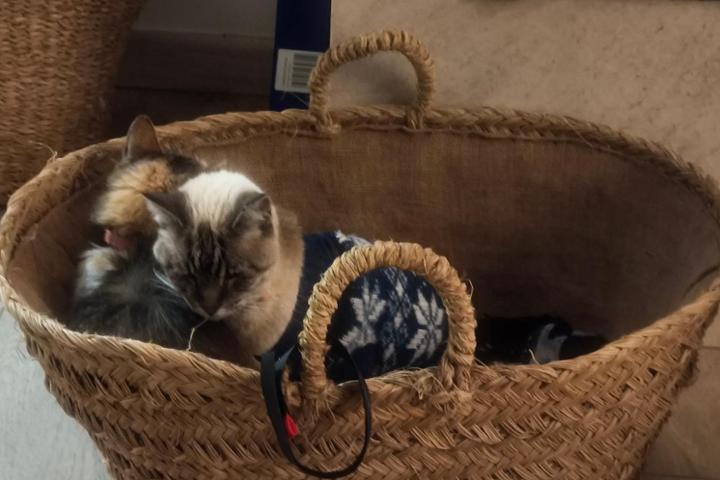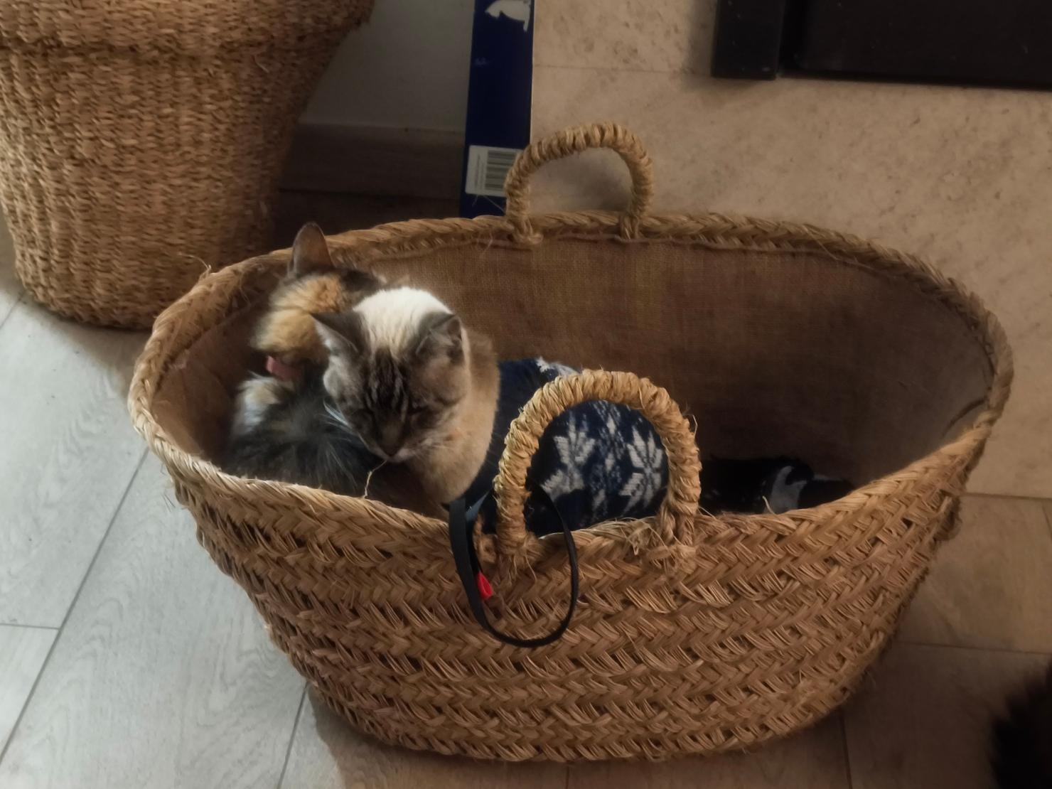 Jeta y Fura en su cesta favorita, delante de la chimenea