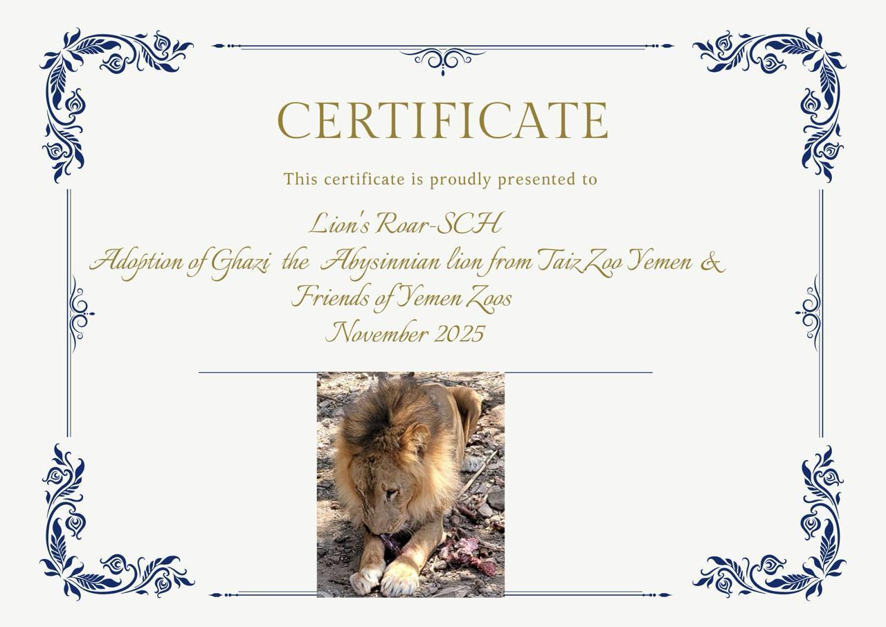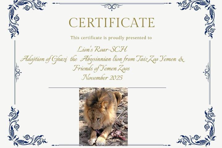 Volvemos adoptar a Ghazi, este fabuloso león que vive en el zoo de Yemen. Gracias a la colaboración y esfuerzo de "Friends of Yemen Zoo", los animales del zoo tienen nuevos recintos más amplios, donde pueden tomar el sol, también les han hecho llegar vitaminas y medicamentos para que estos animales tengan una vida digna dentro del conflicto bélico que esta viviendo el país. Graciasss de corazón por vuestra colaboración.