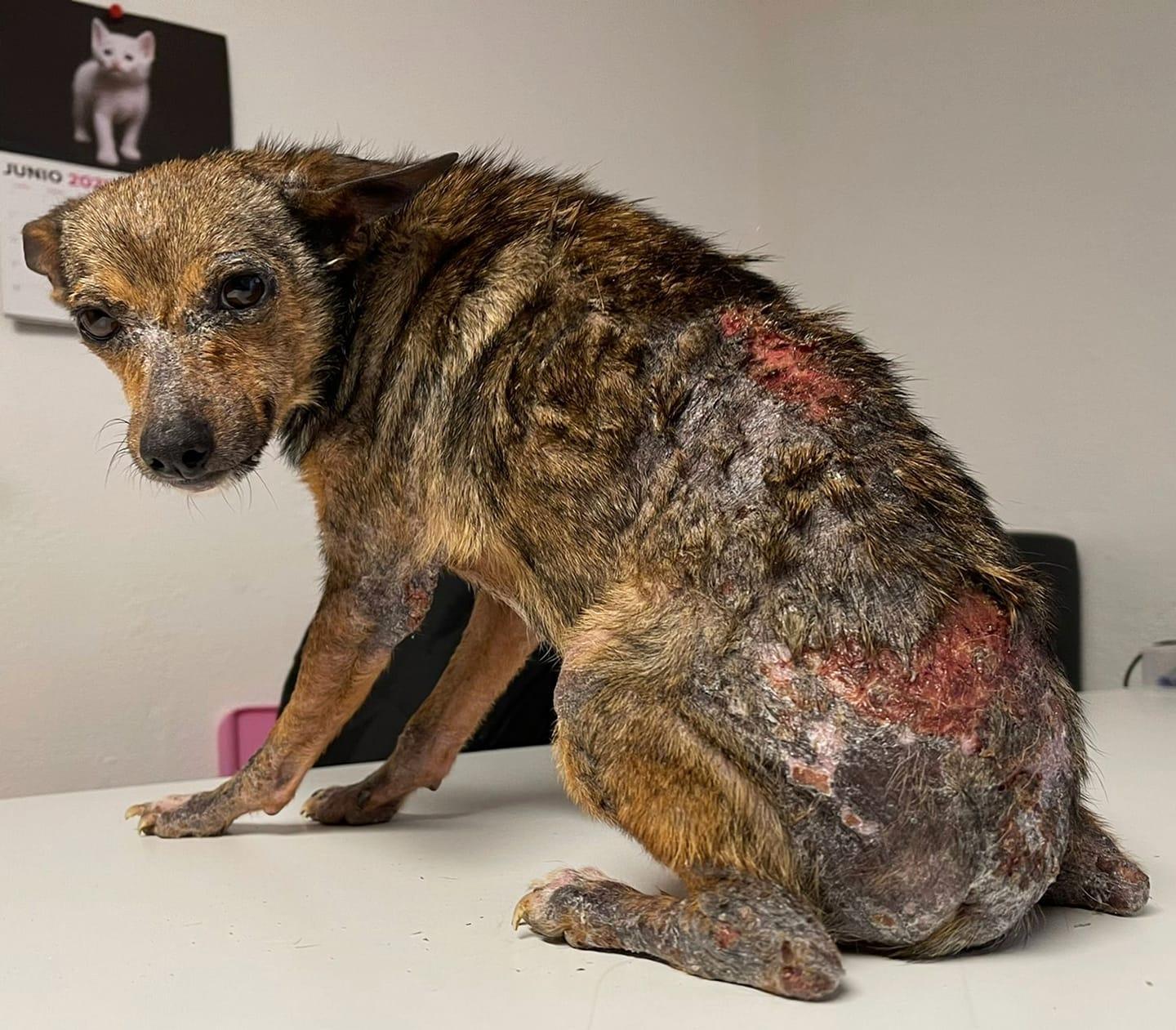 Julia llegó hace unos días desde Huelva. Su estado era lamentable, las enfermedades provocadas por parásitos estaban acabando con ella, pero ya está en tratamiento. Sus ojos también venían muy mal, pero la hemos llevado al centro oftalmológico y ya está siendo tratada. A pesar de todo, Julia es muy buena y agradecida, nos tiene enamorados, siempre moviendo el rabito, dejándose curar aunque la piel de su carita se le caiga a trozos. Es todo un ejemplo de falta de rencor, de confianza y nobleza. Seguimos luchando junto a ti, Julia. Tu recuperación es nuestro objetivo y será nuestra recompensa.