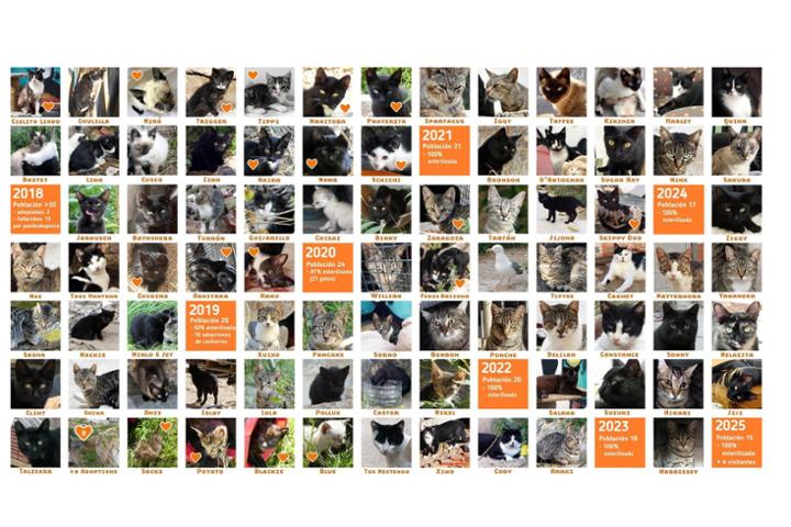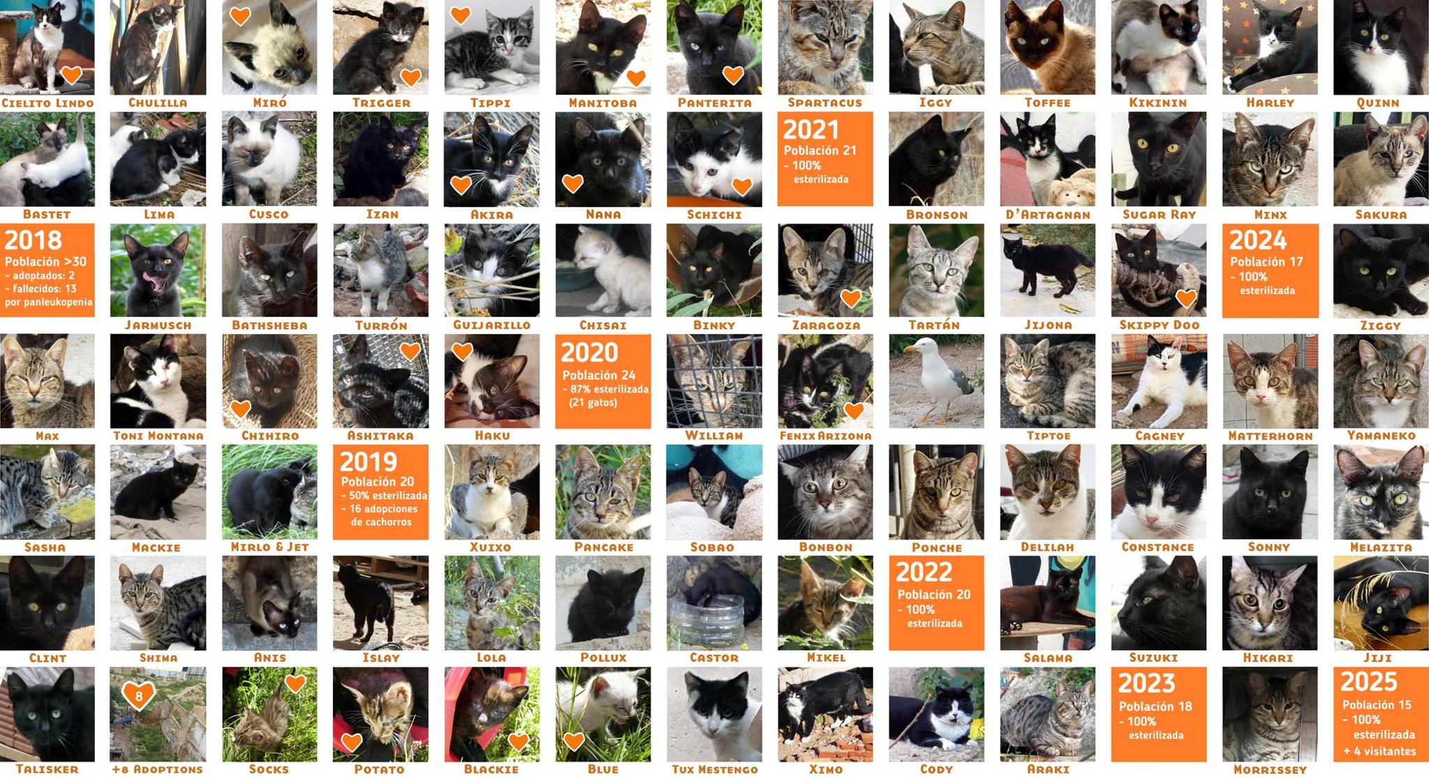 Historia de la colonia desde 2018. Todos los gatos que han pasado tiempo allí y unos 15 que siguen disfrutando de su hogar. Las fotos con corazón son de gatos que han sido adoptados.