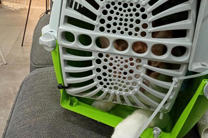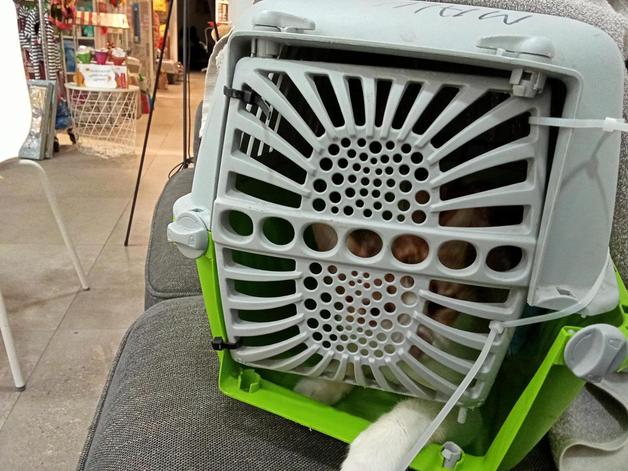 Os dejo una foto de la chiquiturra en la clínica antes de ser intervenida, tuvimos que poner bridas al trasportín ya que estaba super nerviosa... Sacando su manita...