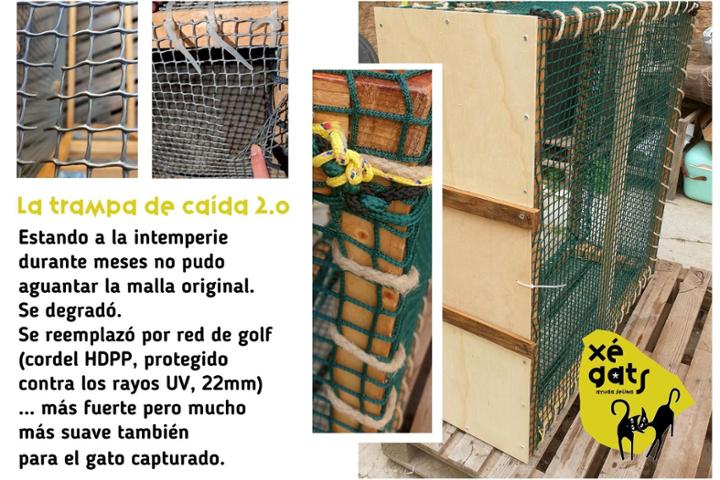 Después de unos meses a la intemperie ha fallido la malla original de la trampa de caída ( drop trap). Se degradó la malla - de manera casi invisible - y nos escapó una gata (que hemos capturado la semana siguiente con otra trampa). Una decepción.
