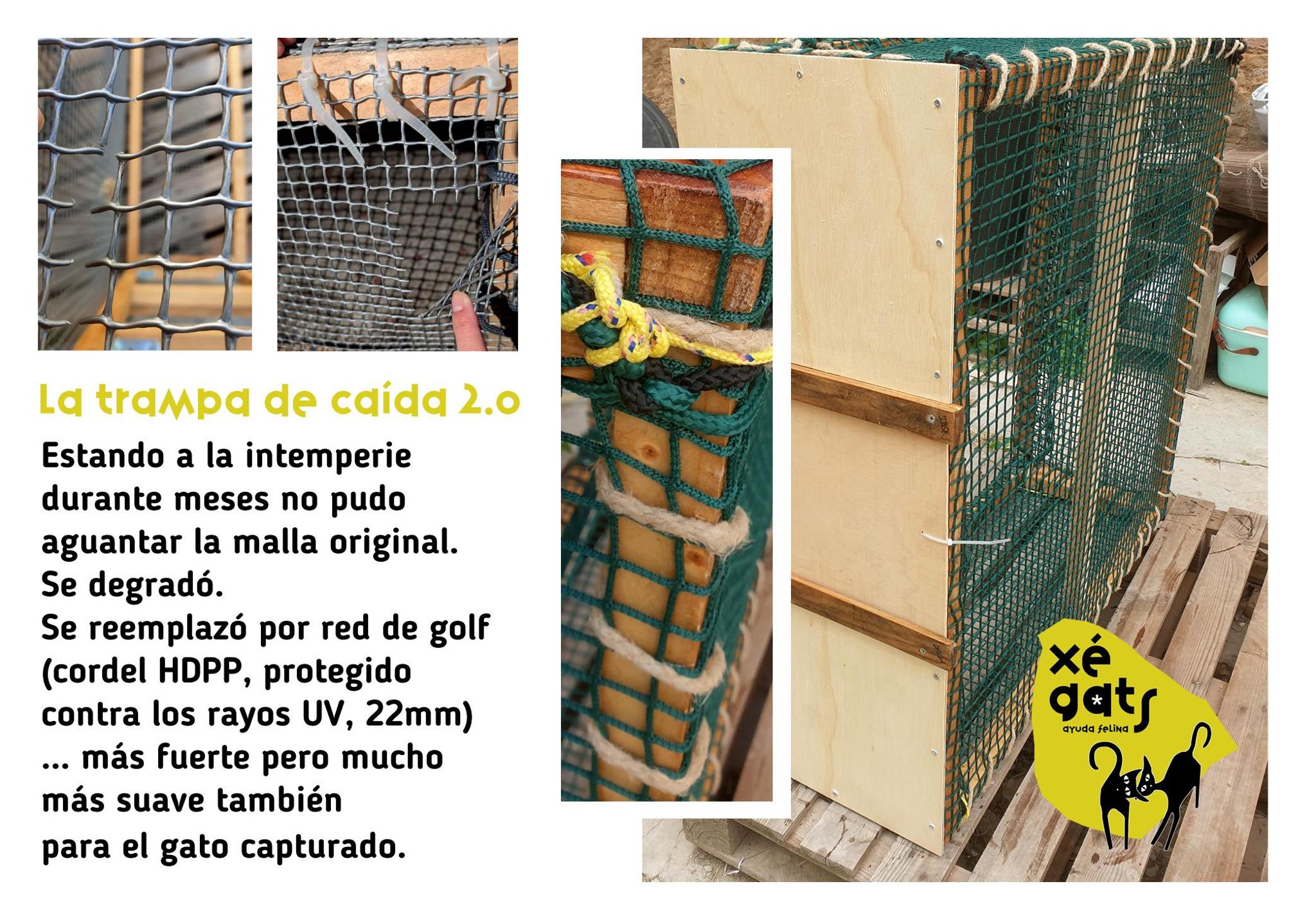 Hemos remplazado la malla con una red de golf (malle de 22mm) hecho de cordel HDPP y protegido contra los rayos UV. Es mucho más fuerte pero también más suave. Mejor para todos. Ya ha capturado a 2 gatos.