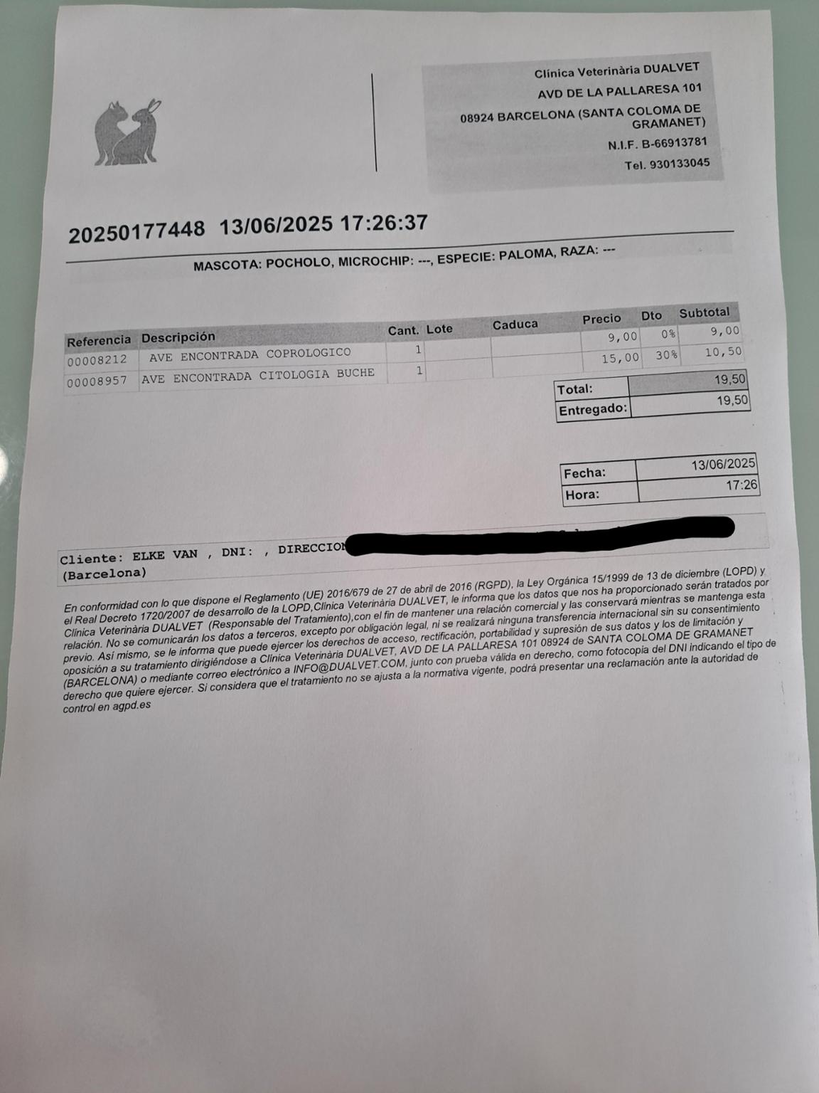 Timotea, tórtola con rotura de buche e infección. Necesita cirugía cuánto antes pero la encontré en el festivo de hoy. A ver si aguanta hasta mañana y ojalá le puedan operar a tiempo aun..