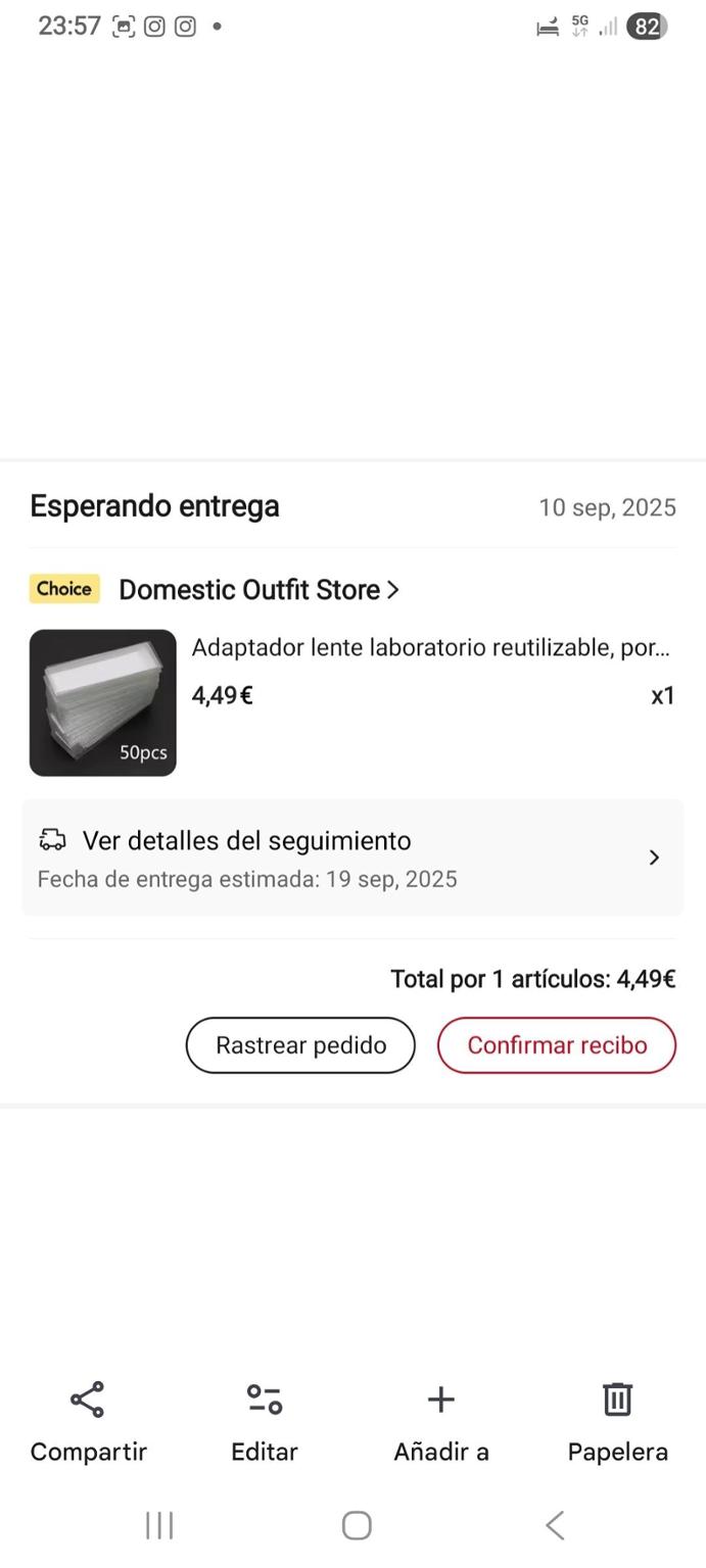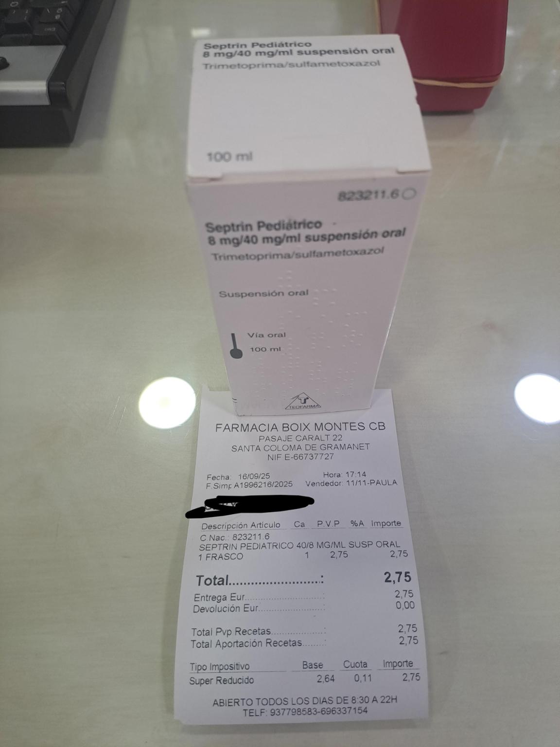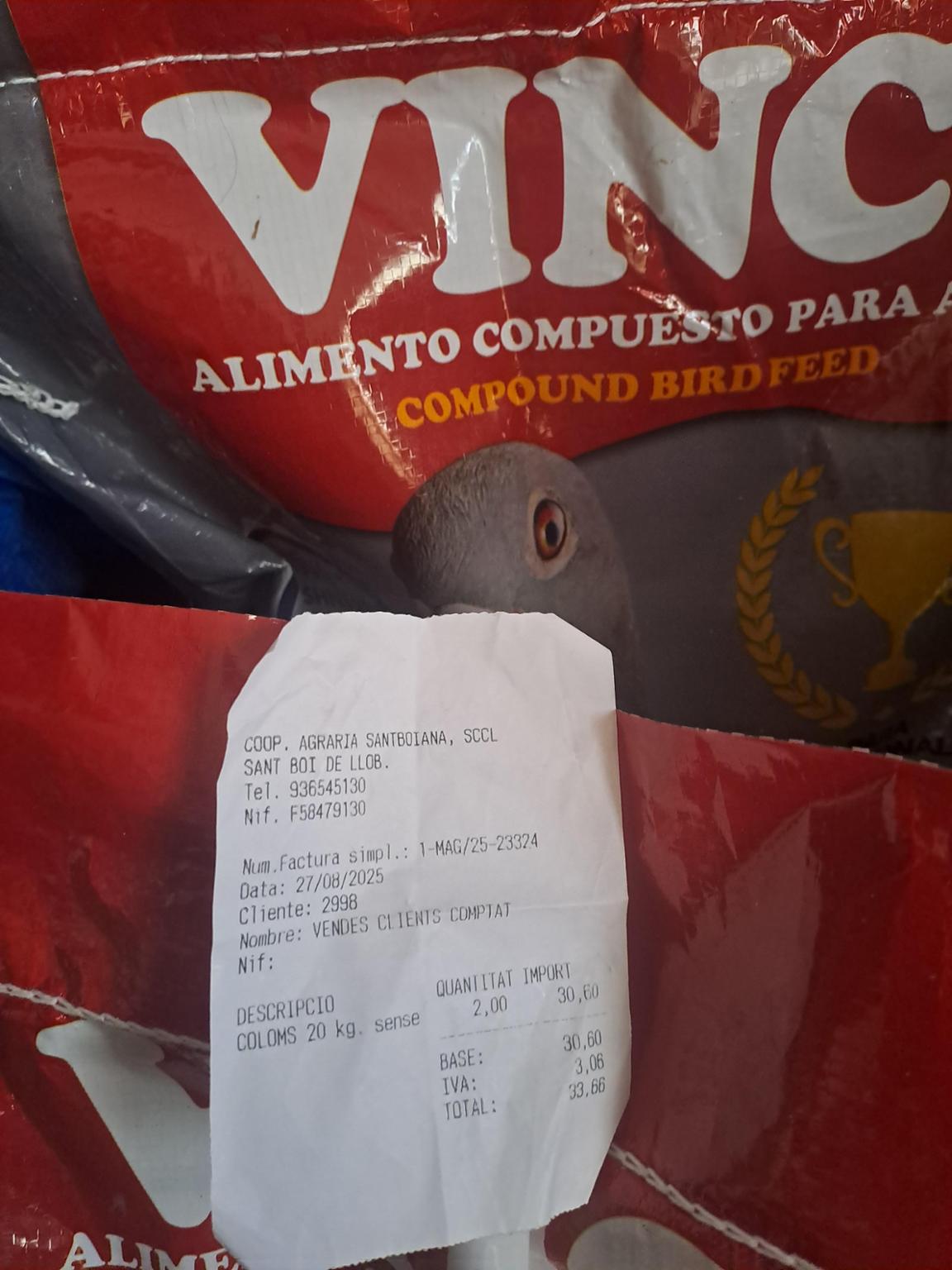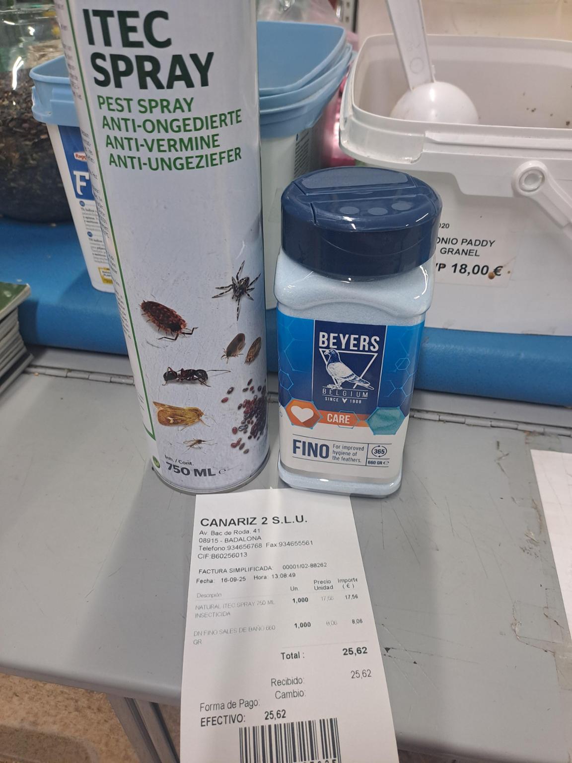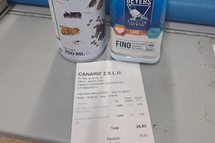 Compra de spray desparasitante y sales de baño para palomas. 25,62 euros.