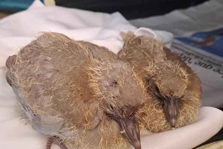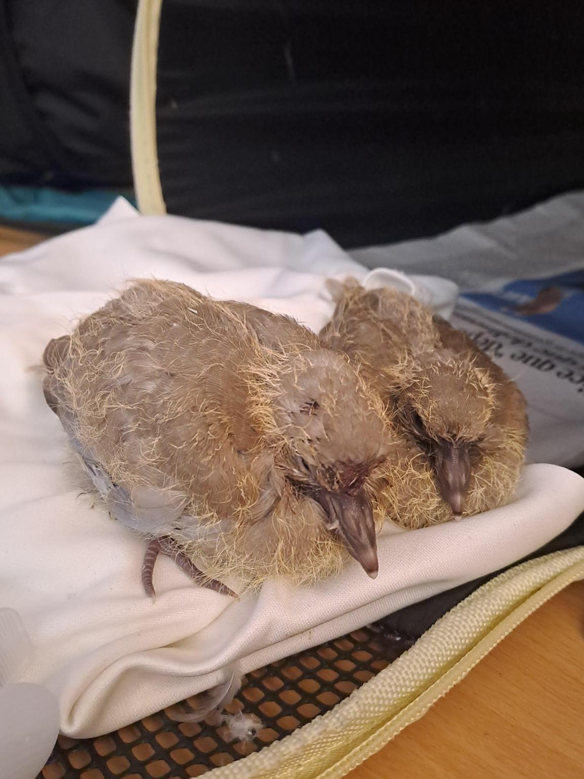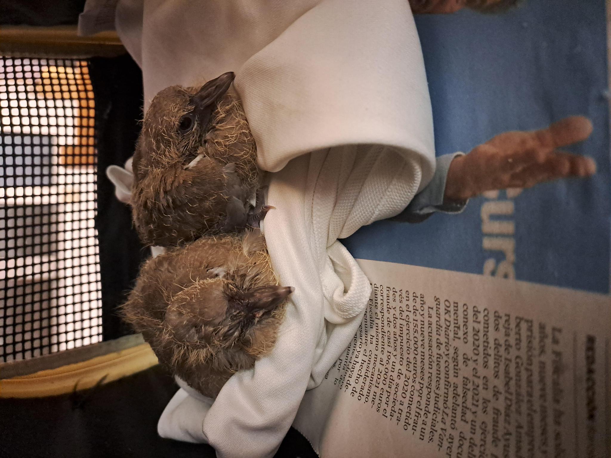 Talia y Tamara, 2 crías de tórtola que una urraca tiró de su nido.