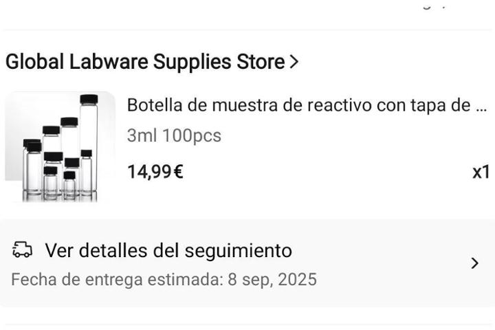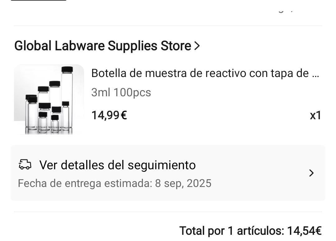 Compra de botellas de 3ml para guardar medicación. 14,99 euros.