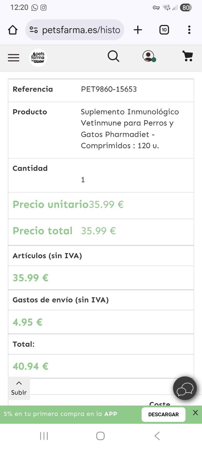 Compra de suplemento para el sistema inmune. 40,94 euros. (Comprado para Peewee que falleció, pero servirá para otras que vienen con el sistema inmune bajo)