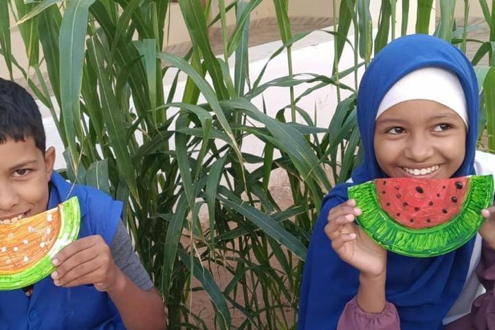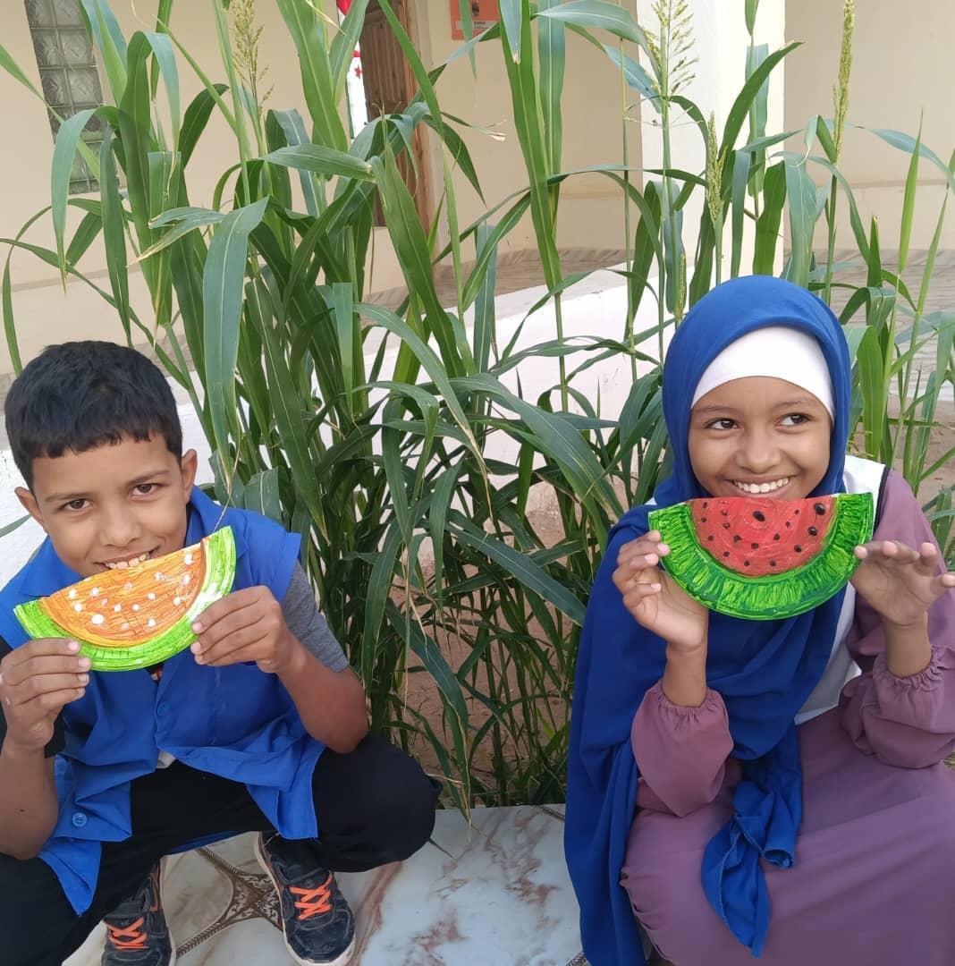 ¡Qué sano es comer fruta, cuántas vitaminas! A,B,C y K, todo un alfabeto de ellas. Pero las frutas de los niños del BUBISHER son especiales: una es una mezcla de melón, naranja y galleta María, riquísima, le proporciona al niño una mirada inocente y traviesa a la vez, como si estuviera pensando solo me queda una, y me la voy a comer yo solito. La otra, en cambio, es una fruta muy especial, es una fruta grande y muy refrescante, muy jugosa y dulce, llena de agua, baja en calorías y rica en vitaminas A y C, en potasio y antioxidantes. Y tiene una propiedad muy especial, casi mágica, se puede comer pero también se puede pensar, soñar, dibujar y llevar como bandera, tiene el don de la solidaridad; cuando una la ve, con esos colores tan vivos, nos recuerda lugares donde la fruta está prohibida. Bueno, la fruta y la vida. La niña que sonríe con esa rodaja mágica de sandía es hermana de todas esas niñas palestinas que ya no pueden comer sandía. Su sonrisa es para los que cortan la fruta cuando está en su máximo esplendor como una advertencia, les está diciendo a esos hijos de la gran fruta que su energía y sus ganas de vivir se las han transmitido todos esos niños y niñas palestinas con las que comparte sandía y bandera, les está desafiando a seguir sonriendo a pesar de todo, a convertirse en una mujer capaz de todo, a seguir dibujando sandías y soles, y flores, y mañanas sin genocidas ni asesinos de niños. Con un cuento y una sonrisa como fusil; la munición está en nuestras bibliotecas.