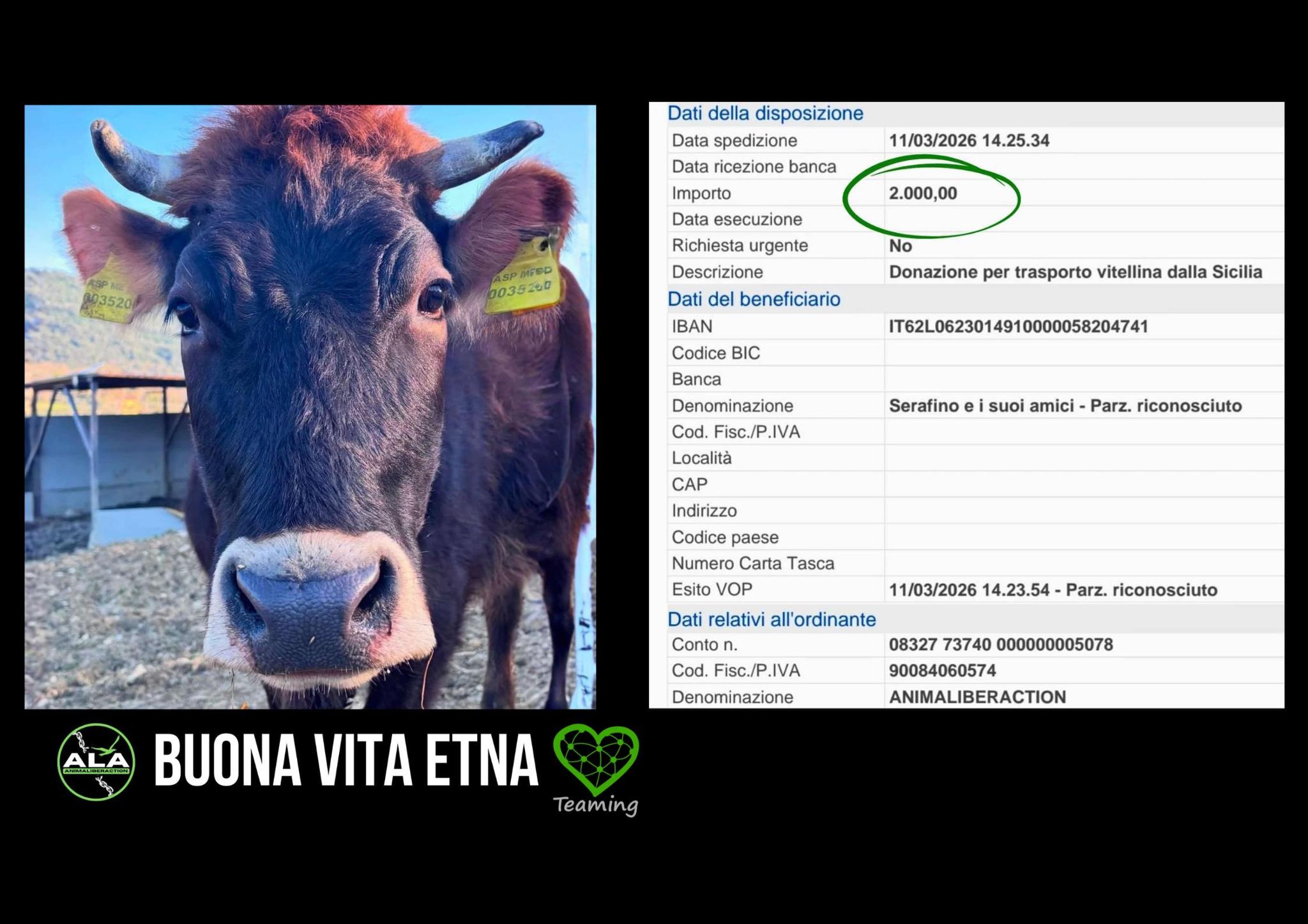 Etna è una vitella che nel 2024 è stata trovata in un furgone con le zampe legate; alcuni mesi fa il rifugio L'Arca di Natalia (Sicilia) ci ha contattato e ci ha detto che, dopo due anni, la vitella aveva finalmente trovato casa e andava urgentemente trasferita al rifugio Serafino e i suoi amici in Campania.