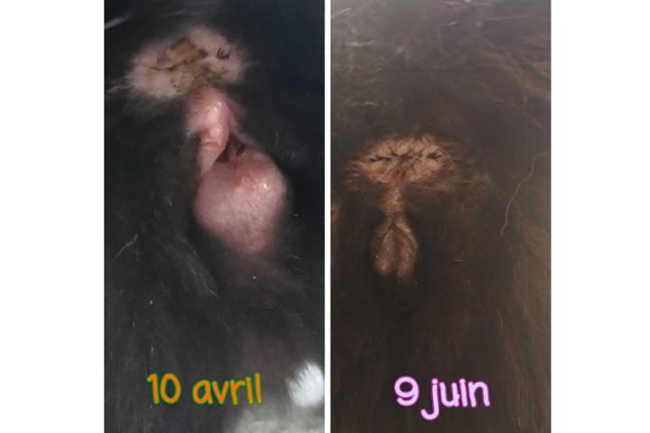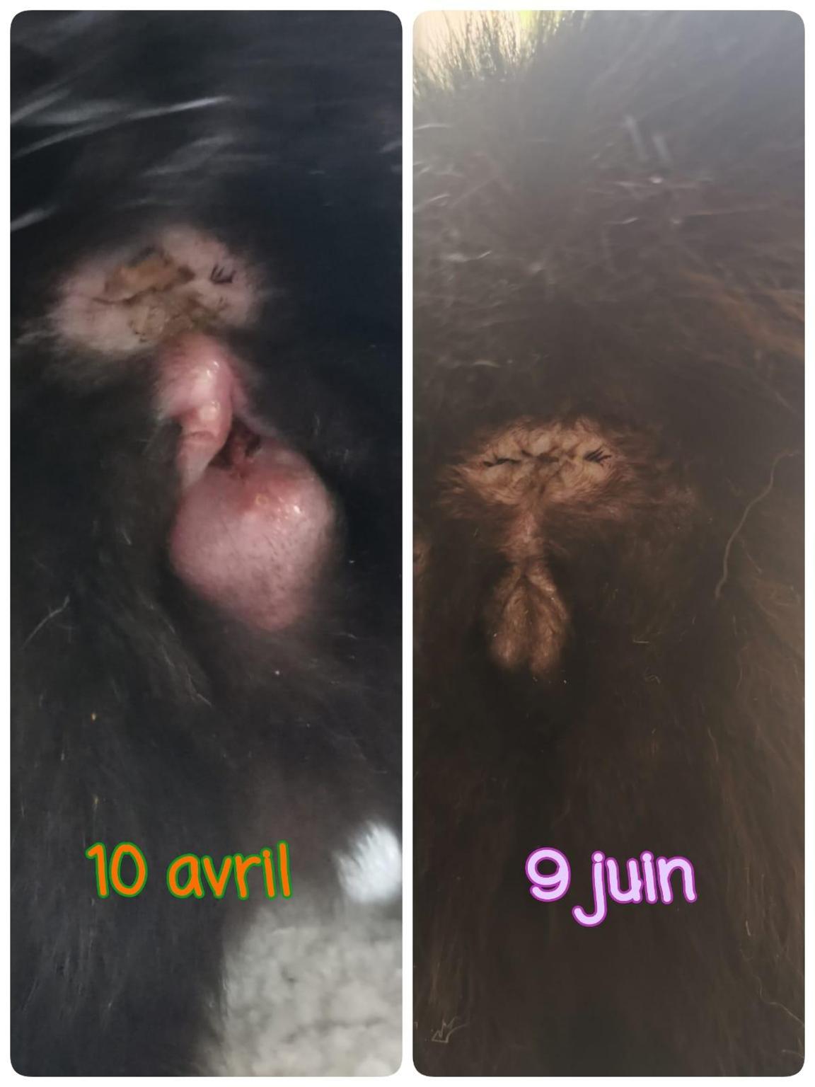 Bonjour à tous, je suis retournée voir le vétérinaire 2 fois pour Kali ces dernières semaines, pour son problème d'enflement des lèvres génitales. Elle est sous traitement encore avec une injection de cortisone à retard avec des antibiotiques en cas de risque infectieux à cause de l'abaissement de l'immunité due à la cortisone; pour l'instant ça a bien dégonflé, donc je croise les doigts pour que ce traitement soit le bon. Je règle donc les factures en attente avec ce dernier virement, grâce à vous tous. Un grand merci pour elle et désolée pour l'image XD