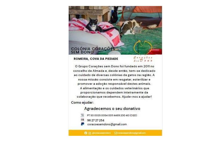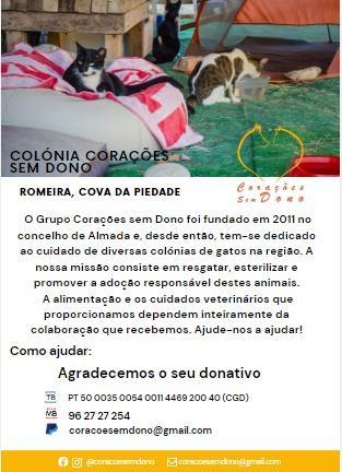 O Grupo Corações sem Dono foi fundado em 2011 no concelho de Almada e, desde então, tem-se dedicado ao cuidado de diversas colónias de gatos na região. A nossa missão consiste em resgatar, esterilizar e promover a adoção responsável destes animais.