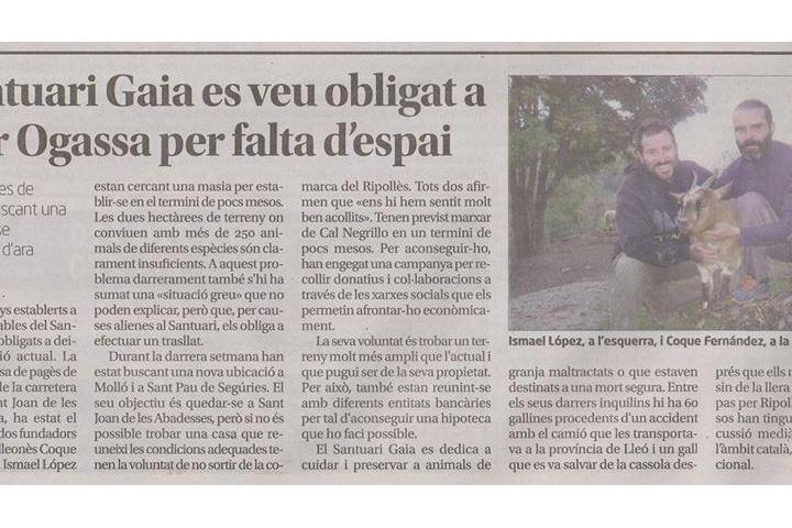 Santuario Gaia salió ayer en el Diari de Girona explicando que nos tenemos que marchar porque los habitantes del Santuario se quedan sin hogar.