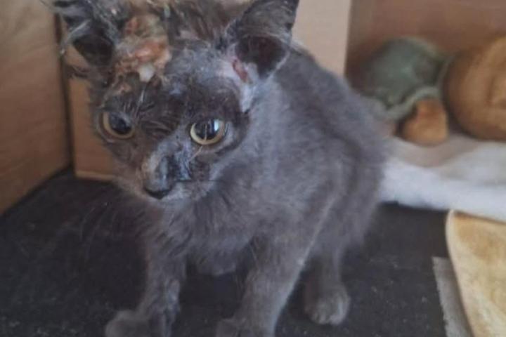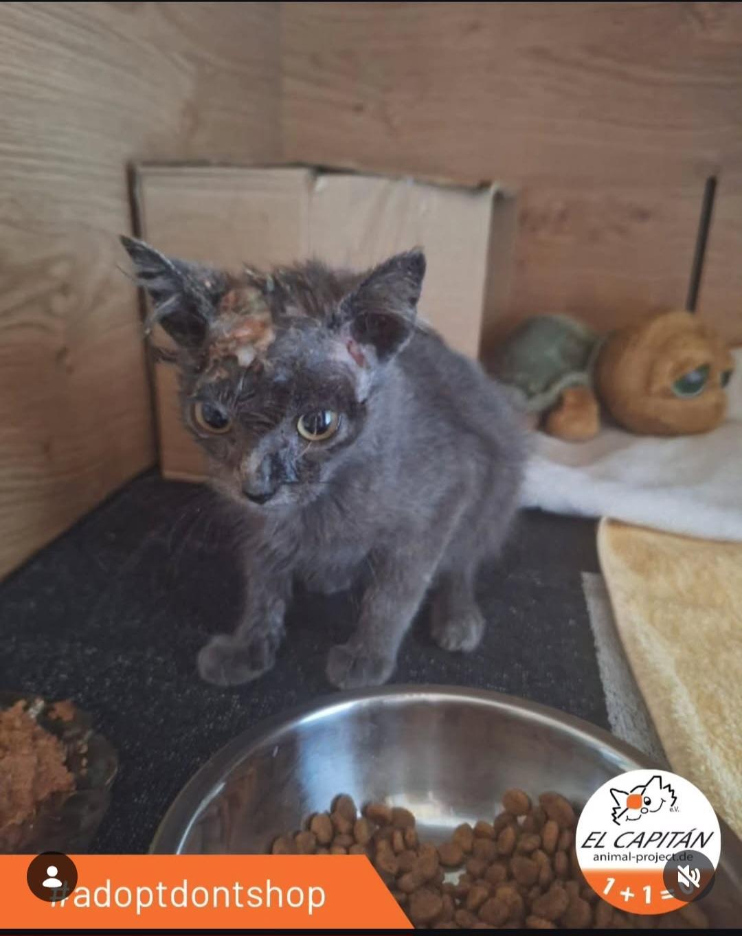 Not long after, another emergency call reached us: a tiny kitten, barely three months old, was in urgent need of help. Luckily, our vet clinic was still open, so we rushed little Astra there. She received deworming and flea treatment, and now continues with antibiotics and special eye care. For now, Astra remains at the clinic – unless a foster home can be found where she can receive the attentive care she so badly needs.