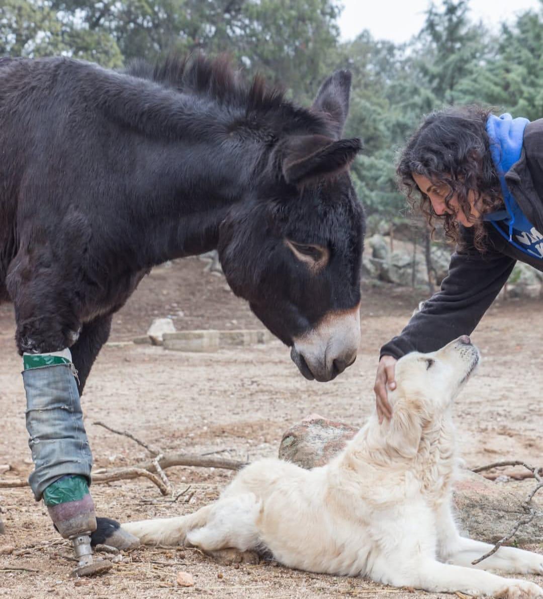 Dani a été le premier âne amputé d’Europe (lorsqu’il était petit, il y avait quelque part aux États-Unis une ânesse aux pattes amputées). Il est sûrement celui qui a vécu le plus longtemps. Quand il était petit, il était si populaire que grâce à lui nous avons pu sauver beaucoup d’autres animaux. Grâce à lui, de nombreuses personnes nous ont suivis, ont changé leur conscience et sont devenues véganes. À la surprise des sceptiques et des vétérinaires, Dani a vécu 12 années heureuses, auprès de sa mère, et n’a été sevré qu’après avoir eu plus d’un an (en raison d’une hospitalisation pour une blessure). Il a joué avec moi, avec Rudy , avec Grisom , Rubia et avec toutes les ânesses qui sont passées par ici.