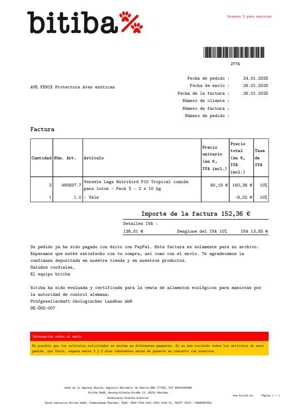 Hace muchísimo que no subimos alguna factura de los gastos de alimentación que supone mantener a las aves que tenemos.