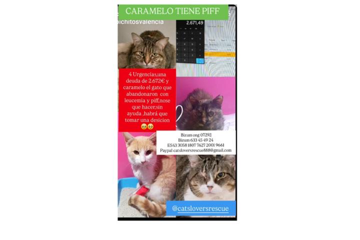 4 URGENCIAS,UNA DEUDA DE 2.672€ Y CARAMELO EL GATO ABANDONADO CON LEUCEMIA Y PIFF,NOSE QUE HACER,SIN AYUDA ,HABRÁ QUE TOMAR UNA DESICION RESPECTO A CARAMELO,PORQUE SINO SE TIENE PARA PAGAR LA DEUDA,MUCHO MENOS PARA EL TRATAMIENTO DEL PIFF.....EN VUESTRAS MANOS ESTÁ SU VIDA.