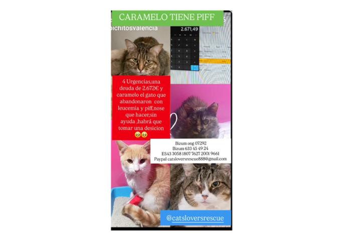 4 URGENCIAS,UNA DEUDA DE 2.672€ Y CARAMELO EL GATO ABANDONADO CON LEUCEMIA Y PIFF,NOSE QUE HACER,SIN AYUDA ,HABRÁ QUE TOMAR UNA DESICION RESPECTO A CARAMELO,PORQUE SINO SE TIENE PARA PAGAR LA DEUDA,MUCHO MENOS PARA EL TRATAMIENTO DEL PIFF.....EN VUESTRAS MANOS ESTÁ SU VIDA.
