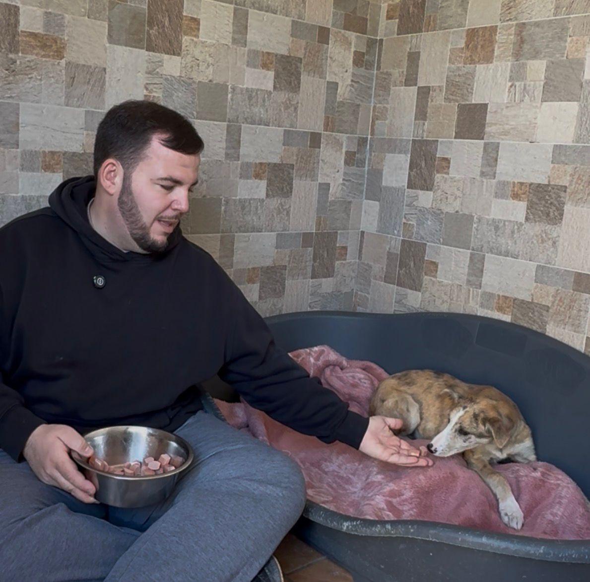 Cuando nos llamaron para decirnos que lo habían dejado en la basura, en Murcia, nuestro voluntario Rubén, en cuanto salió de su trabajo en Madrid, fue hasta allí y llegó muy tarde a casa con él.