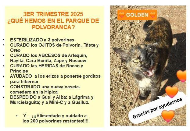 En Enero 2025 • Hemos ESTERILIZADO a 15 polvorines | • CURADO a Rati , a Asmi y a Pirata | • ENTREGADO a su mami a Apola, que llegó perdida a Polvoranca | • ACONDICIONADO la Colonia de la Torre y RENOVADO la de los Arcos | • DESPARASITADO a 7 polvorines | • CONSTRUIDO una barricada en el Botánico y una “puerta” a prueba de perretes | • DESPEDIDO a la Abu, a Trueba y a Bowie... | • ALIMENTADO A LOS 250 PELUDITOS que viven en el parque de Polvoranca… con casi 750 KILOS DE PIENSO!!! y más de 300 LATAS DE COMIDA HÚMEDA!!! | • y también les hemos dado todo el AMOR QUE HEMOS PODIDO.