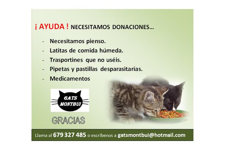 Somos una asociación sin ánimo de lucro, en la cual luchamos por el cuidado y la defensa de los gatos de la calle que viven en diferentes colonias en Santa Margarida de Montbui (Barcelona). Nuestro principal trabajo es cuidar, alimentar, controlar, esterelizar… gatos que se encuentran en la calle. Buscamos gente voluntaria que quieran ayudar aportando su granito de arena a este nuevo proyecto. Tu ayuda, les ayuda!