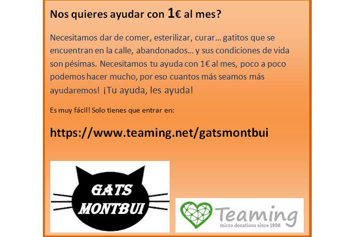 Es un nuevo proyecto creado por personas amantes de los animales y necesitamos dar de comer, esterilizar, curar… gatitos que se encuentran en la calle, abandonados… y sus condiciones de vida son pésimas. Necesitamos tu ayuda con 1€ al mes, poco a poco podemos hacer mucho, por eso cuantos más seamos más ayudaremos! Ellos os necesitan!