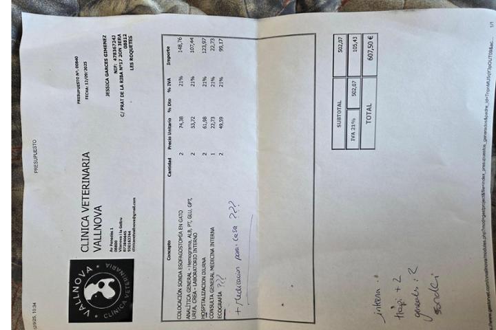 The money is intended for two cats rescued from the street. They are in very bad condition. They are yellow and dehydrated. They need an esophagostomy tube, a general blood test, hospitalization, ultrasounds, and all the medication. The bill amounts to 607.50 euros. I can send photos of both the cats and the invoice or estimate. Thank you.