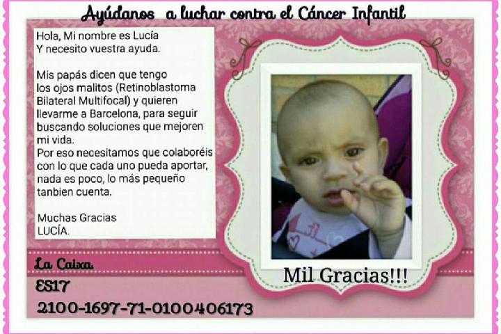 Soy Lucía , mi enfermedad es Retinoblastoma Bilateral, necesito ayuda para seguir mi tratamiento, es un proceso largo y mis padres hacen todo lo que está en su mano, podéis ayudarnos? El retinoblastoma es un cáncer ocular, en el caso de Lucía es bifocal , con lo cuál le afecta a los dos ojos. Ojalá que La MIRADA DE LUCIA no se apague. Agradecemos de antemano todas las colaboraciones que estamos recibiendo, en nombre de sus padres...un millón de gracias.
