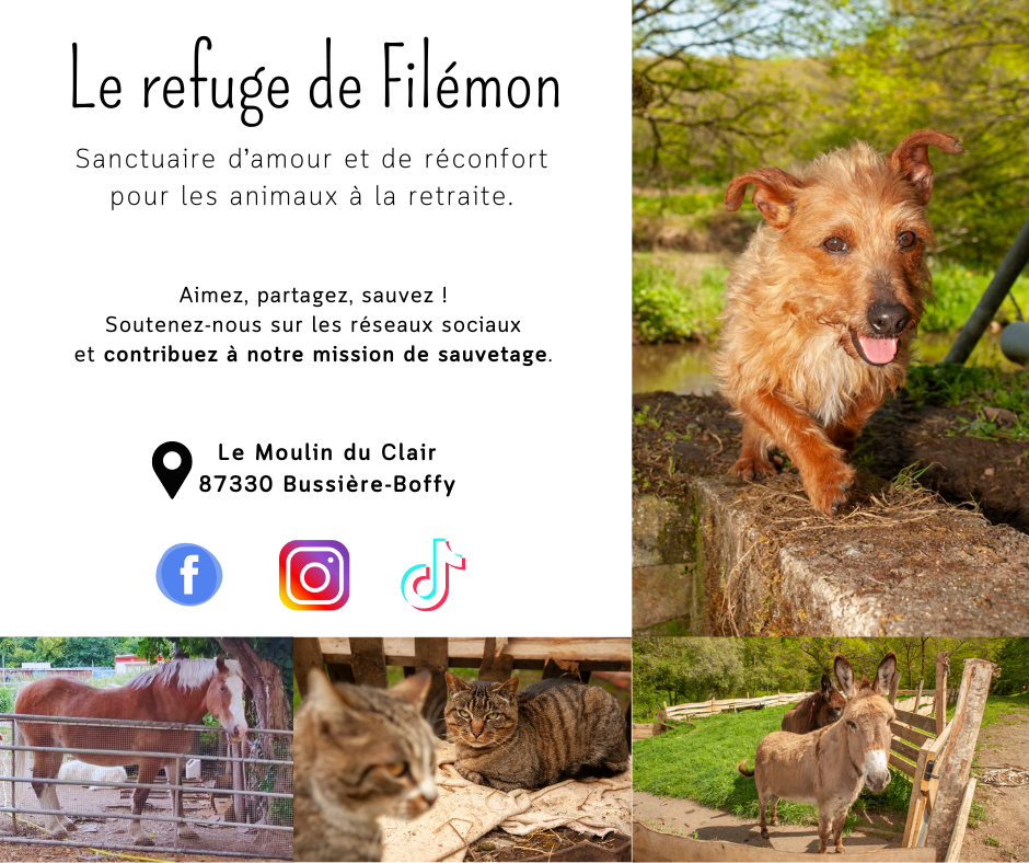 Santuario para animales ancianos abandonados o maltratados. Acogemos a unos 230 animales de todo tipo para permitirles pasar sus últimos días cubiertos de amor. Si podemos ofrecerles la mejor vida posible, es únicamente gracias a sus donaciones, ya que no recibimos ningún subsidio. Para contribuir a la felicidad de los refugiados de Filémon, puedes inscribirte en Teaming. Y recuerda... Nuestro remanso de paz existe gracias a tu apoyo y a tus comparticiones.
