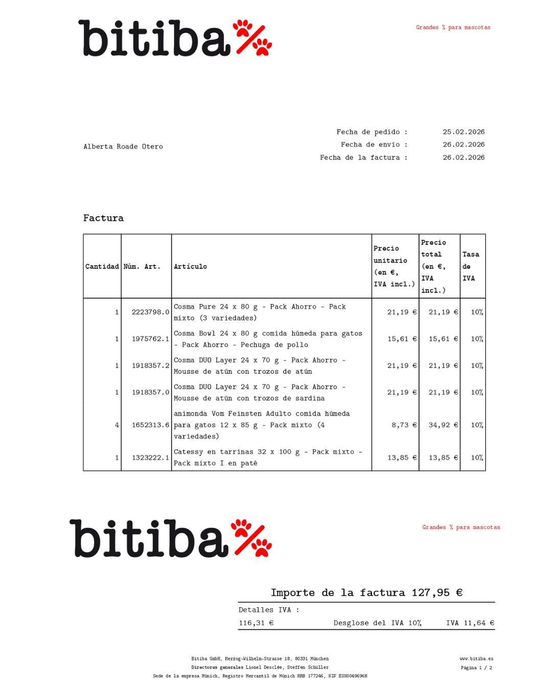 Ésta es una de las facturas de los pedidos que hice en el mes de febrero. La mayoría de los productos corresponde a la comida de Brisa, Anís y Minnie, sacando las tarrinas de Catessy y las latas de Cosma Pure Love, que es la comida que le doy a un gato comunitario que también doy de comer.