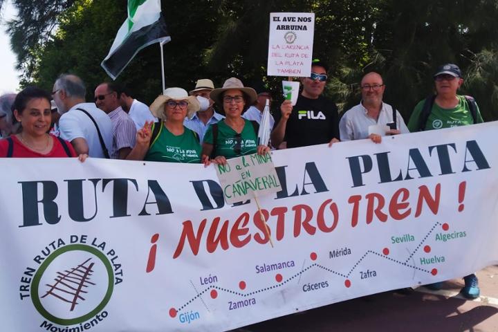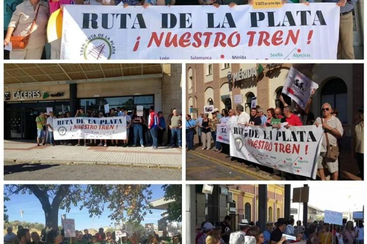 Exigeons un chemin de fer public, social, écologique et durable sur la Ruta de la Plata, unissant les régions de l'ouest de l'Espagne menacées de dépeuplement en raison du manque d'opportunités pour les jeunes. Il s'agit d'une zone privilégiée par son patrimoine historique et naturel, et qu'elle n'a pas besoin de fonder son développement sur les casinos, le nucléaire ou l'exploitation minière à ciel ouvert. Voulons l'échange culturel, l'économie verte et circulaire, la souveraineté alimentaire.
