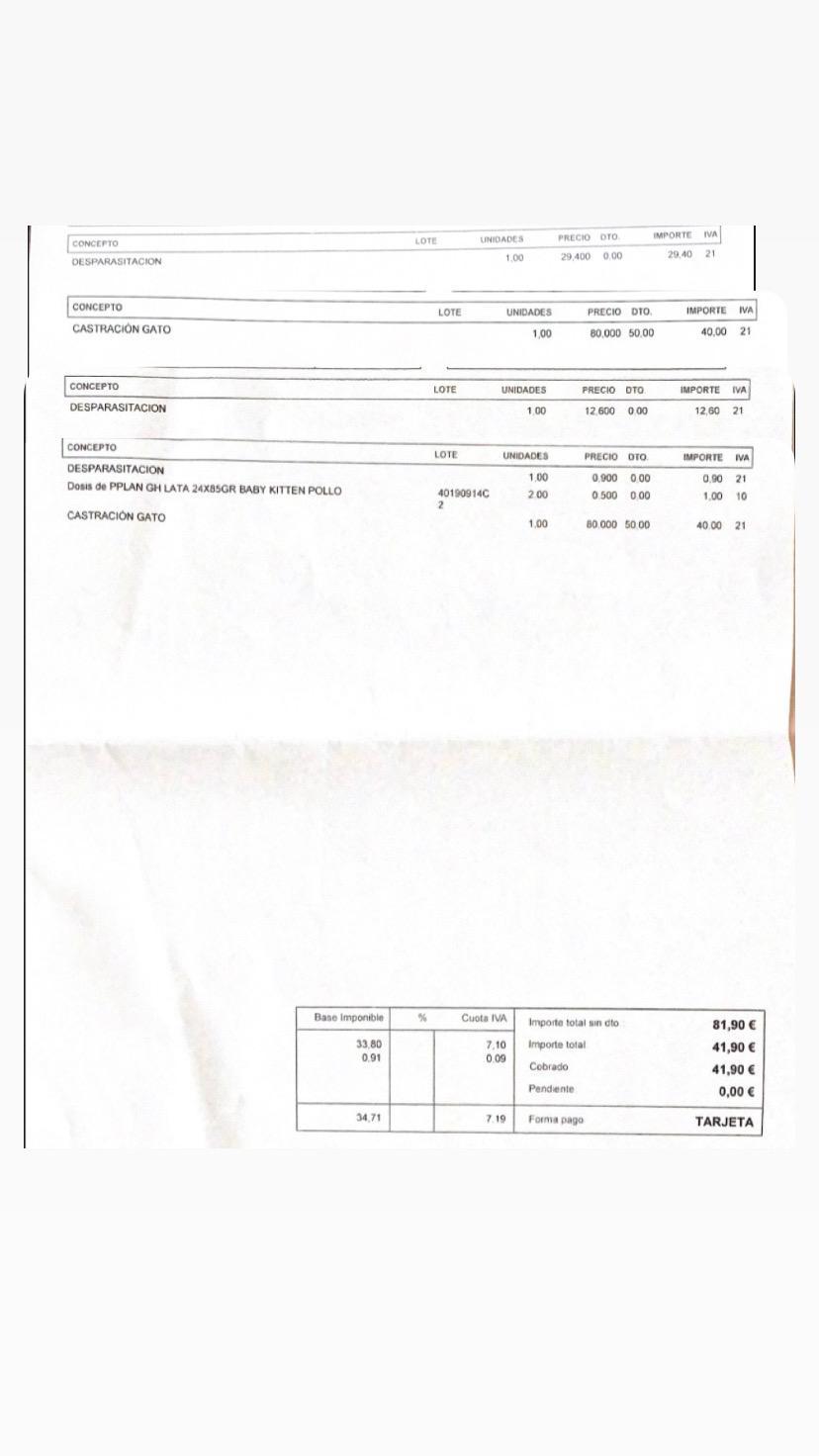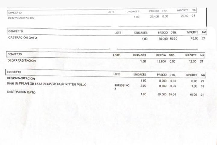 Os dejo algunas de las facturas del veterinario, aparte de comida para ellos y los de la colonia, arena… Han sido más de 120€ SOLO ESTE MES. ¡Gracias por colaborar!
