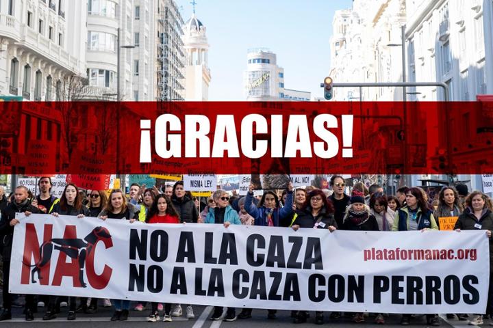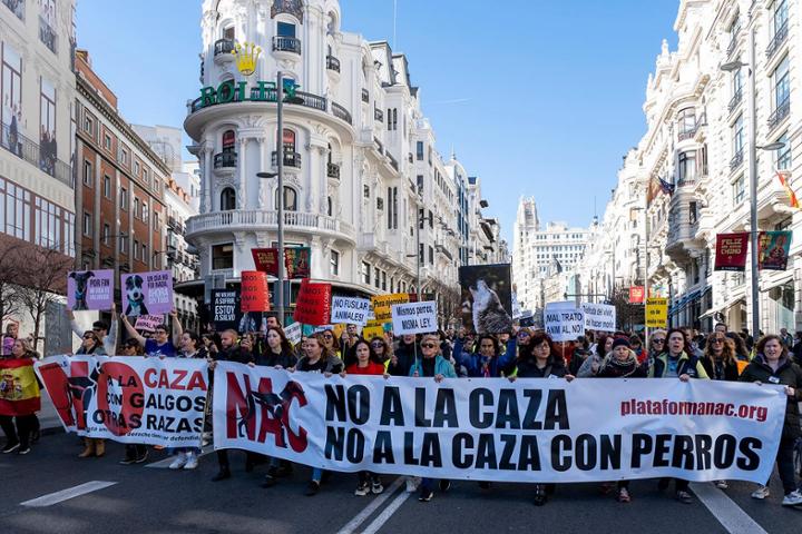 Cada febrero, la Plataforma NAC (No a la Caza) convoca a nivel estatal una manifestación para promover y concienciar sobre el fin de la caza y en particular la caza con perro. España es el único país de la Unión Europea en el que está permitida la caza con perros en modalidades de montería, batidas y caza con galgos.