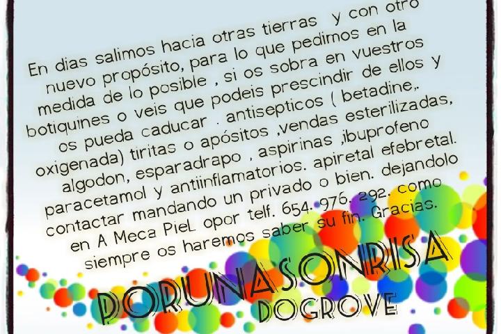 "Me preguntaron en una ocasión . - Por que ? A lo que sorprendida puesto que no me lo habia planteado nunca que surgiera una pregunta... . Contesté.- Por satisfacción propia lo 1º y el compartir. ( es nato). y lo haré mientras pueda, pero tambien sé que lo hago gracias a vuestra confianza y donaciones. puesto que solos, nunca podriamos hacer que fuese de cada vez más y mas especial. Jerejef ( GRACIAS en wolof ) os dicen a todos los que confiais en Porunasonrisa DoGrove "