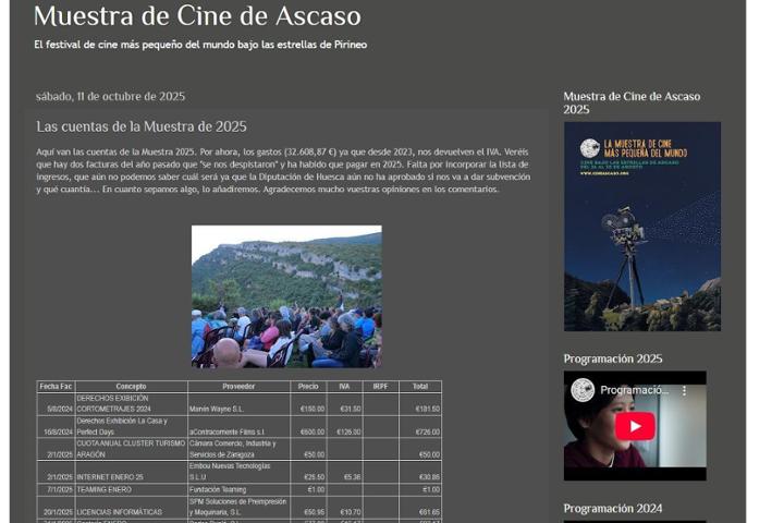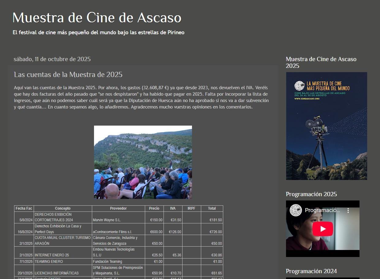 Como cada año, el último acto de la Muestra de Cine de Ascaso es presentar las cuentas. Desde lo más caro (el alquiler de los equipos de proyección y sonido) hasta el último tornillo. Puedes verlas en http://muestracineascaso.blogspot.com/2025/10/las-cuentas-de-la-muestra-de-2025.html . Y, por supuesto, hacer comentarios, sugerencias y/o preguntas. Nos gusta conocer tus críticas y opiniones.