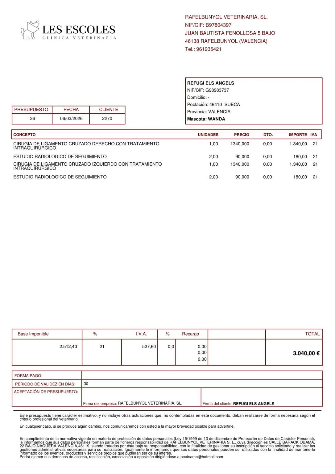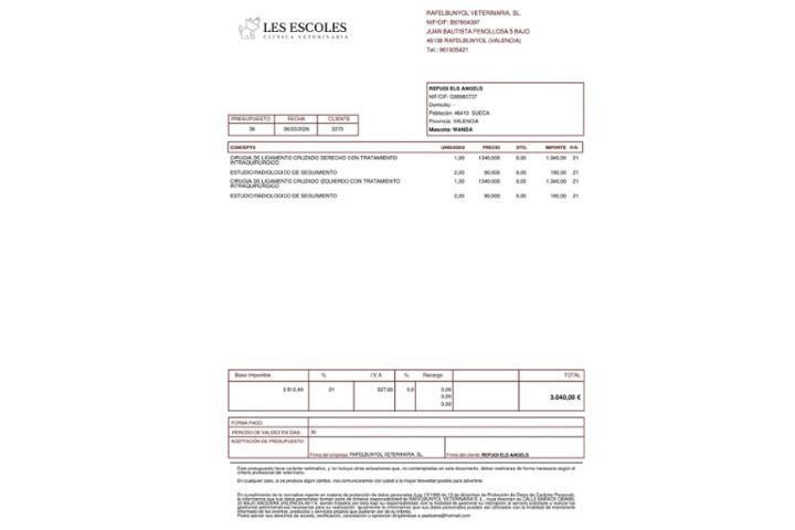 En esta publicación puedes encontrar el presupuesto de la operación, que asciende a 3040€, y el informe veterinario.