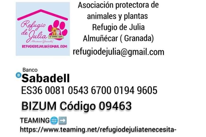 El Refugio de Julia de Almuñecar, está creado para ayudar a los peludos abandonados. En el refugio cubrimos sus necesidades básicas de alimento, salud y sobre todo cariño hasta encontrar adopción. No tenemos subvenciones de ningún tipo, sólo donaciones esporádicas, ayuda de colaboradoras y nuestra, por eso es tan importante la aportación de cada uno de vosotros. Muchas gracias por vuestra ayuda.